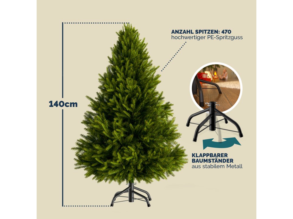 Umělý stromek 140 cm, realistické PE jehličí, vstřikované, 470 větví, stabilní stojan