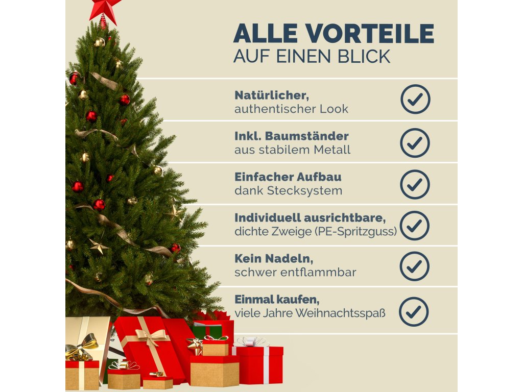 Realistický umělý vánoční stromek jedle 180 cm s hustým PE jehličím, stabilním stojanem a snadnou montáží. Opakovaně použitelný a ekologický.