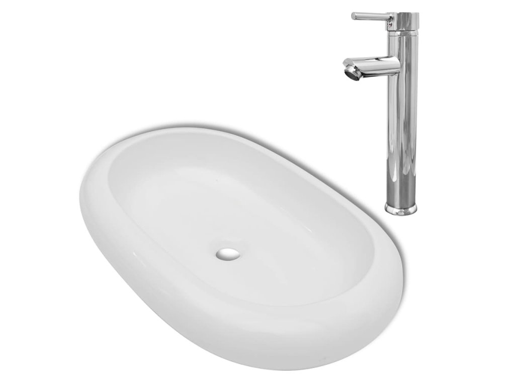 Umyvadlo do koupelny s vodovodní baterií keramické oválné bílé 275496