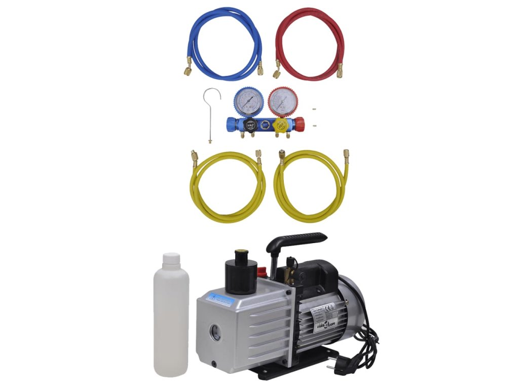 Čerpadlo vytváří podtlak, který umožňuje následné plnění klimatizačního systému chladivem. Čerpadlo má hliníkové pouzdro a praktické okénko pro okamžitou kontrolu hladiny oleje. Má také integrované madlo pro snadné přenášení. Přiložená 4cestná sada na měření je vhodná pro plnění a kontrolu klimatizačních systémů tím, že poskytuje údaje o tlaku v systému. Je vhodné pro použití na všech klimatizacích automobilů, stejně jako komerčních a domácích klimatizačních chladicích systémech. Barevně označená měřidla jsou jasná a snadno čitelná a jsou uzavřena v ochranném plášti, aby se zabránilo poškození. K rychlému a snadnému zavěšení měřidel můžete použít integrovaný ocelový hák. Sada měřidel má odolnou konstrukci.