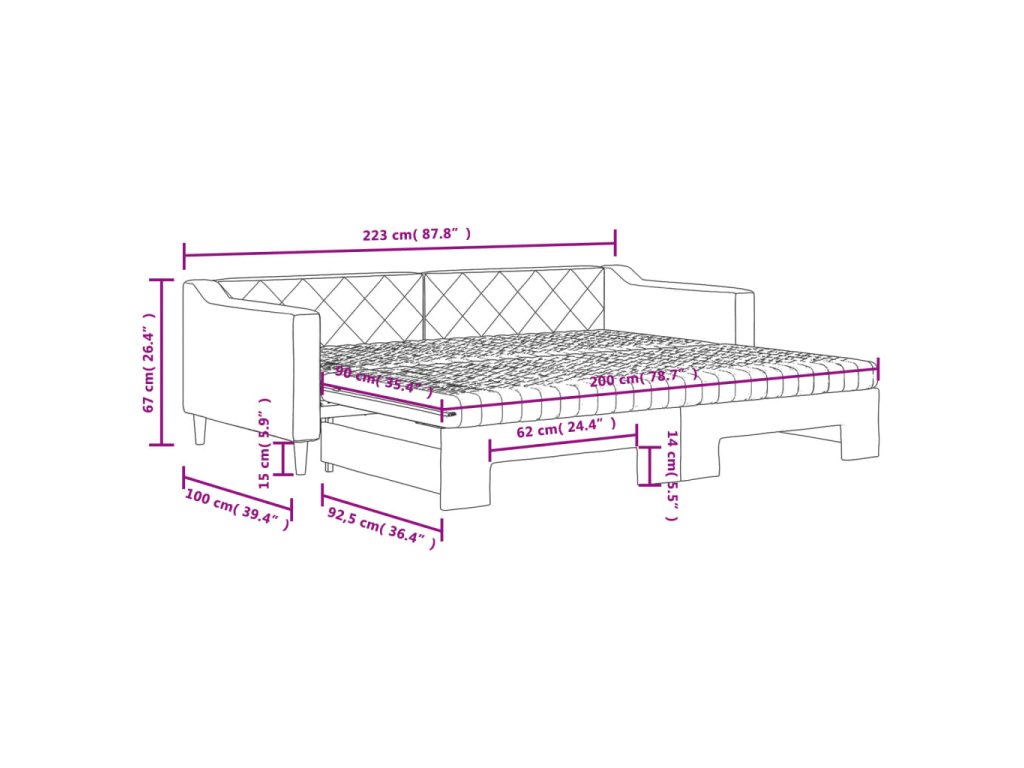 - Rozměry (nevysunuté): 223 x 100 x 67 cm (D x Š x V)