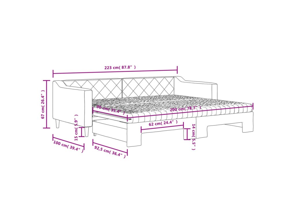 - Rozměry (nevysunuté): 223 x 100 x 67 cm (D x Š x V)