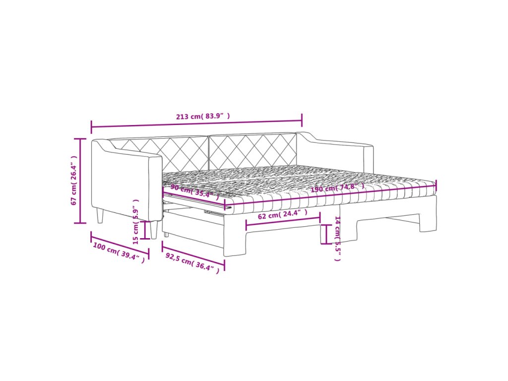 - Rozměry (nevysunuté): 213 x 100 x 67 cm (D x Š x V)