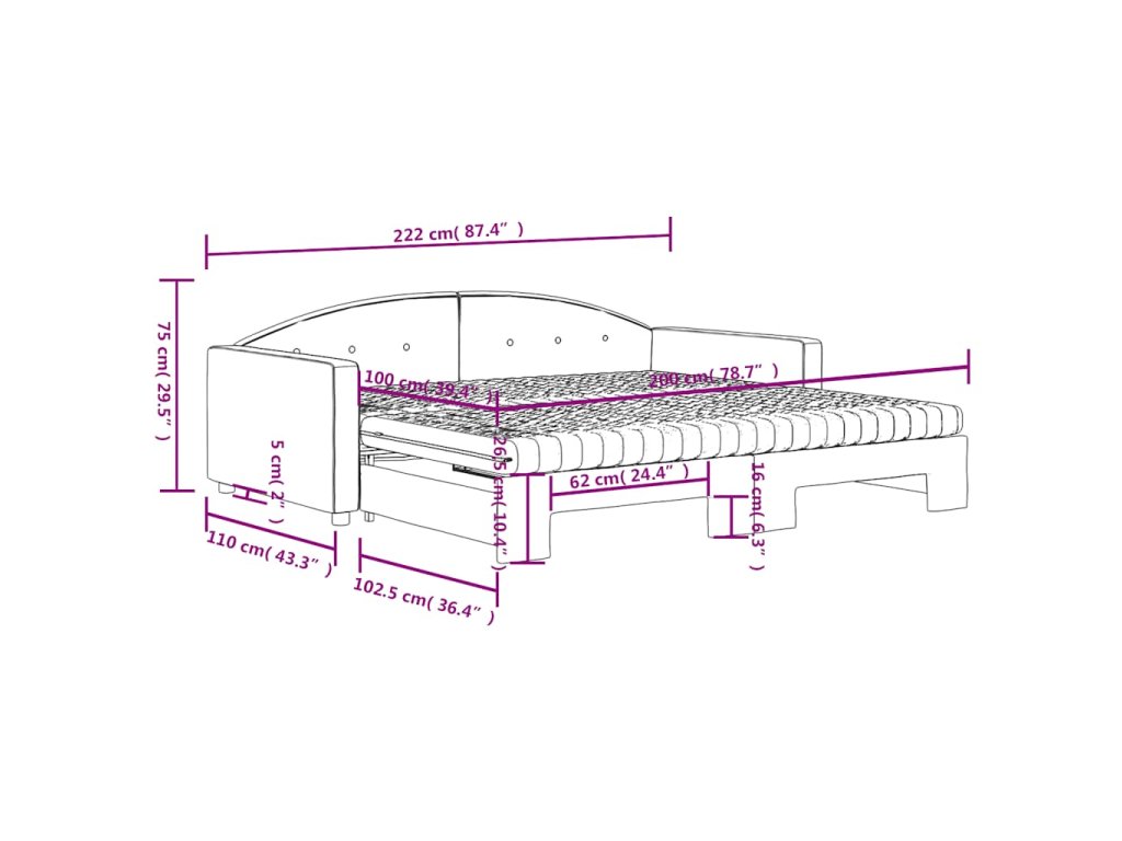 - Rozměry (nevysunuté): 222 x 110 x 75 cm (D x Š x V)