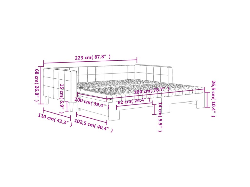 - Rozměry (nevysunuté): 223 x 110 x 68 cm (D x Š x V)