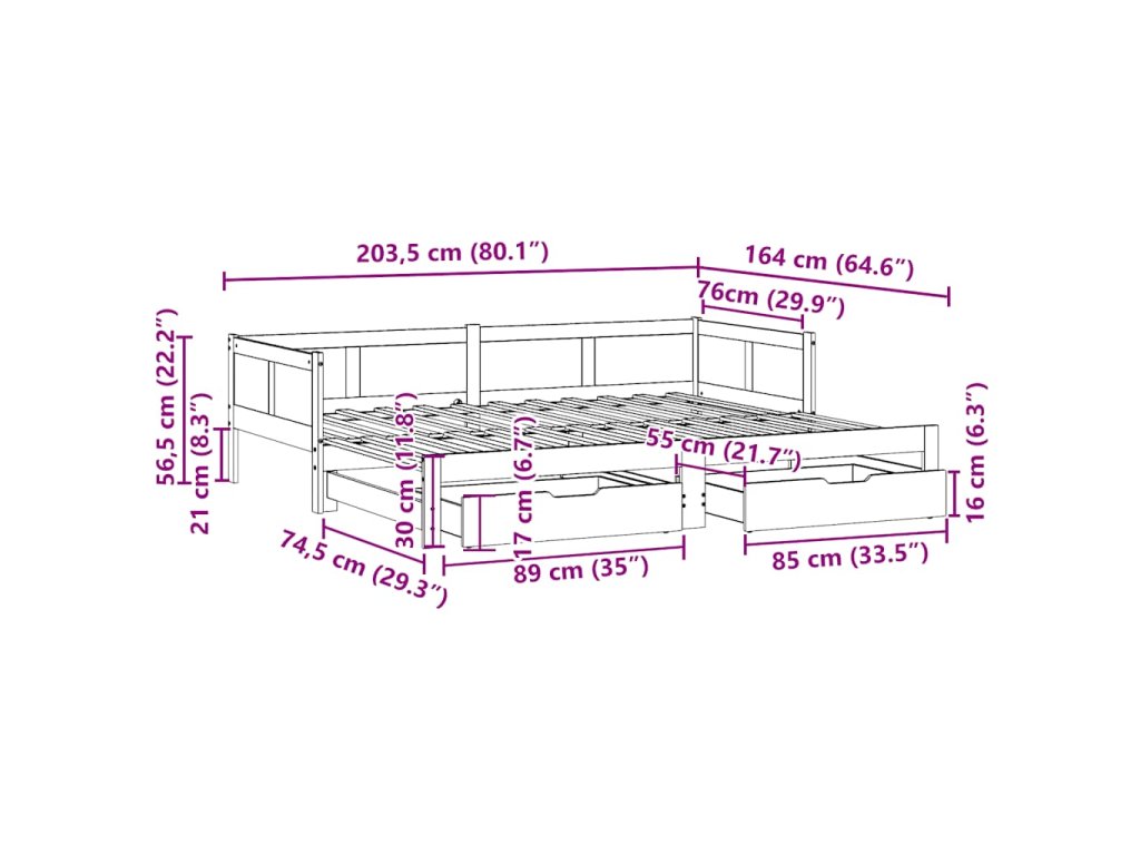- Rozměry (nevysunuté): 203,5 x 76 x 56,5 cm (D x Š x V)