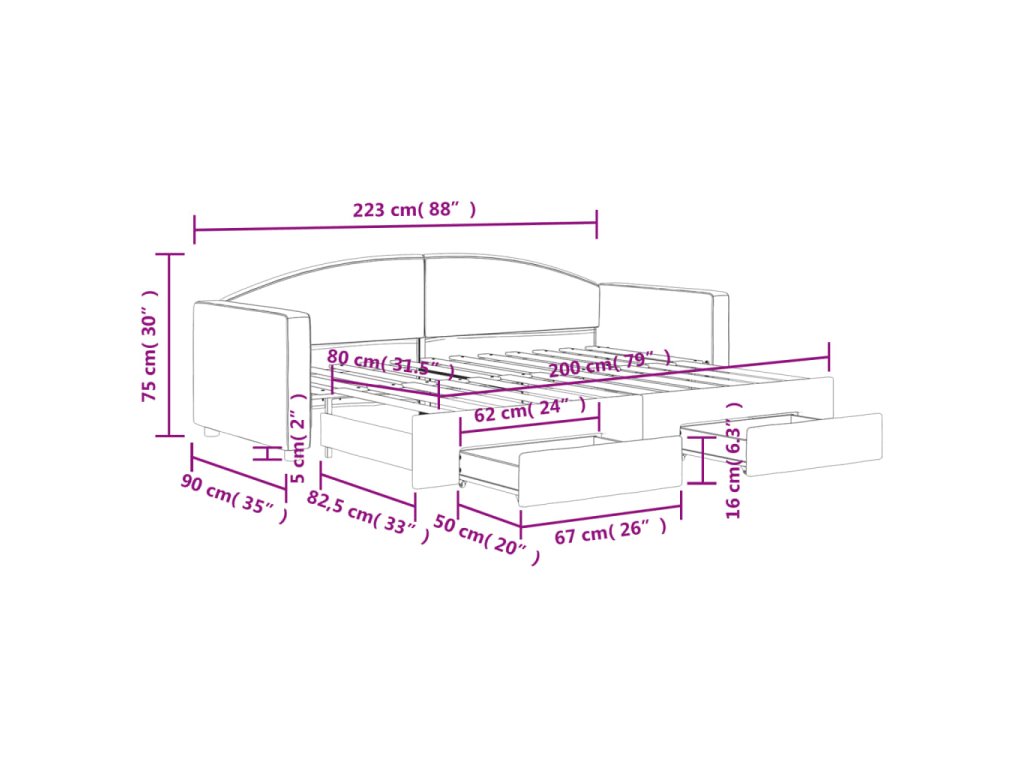 - Rozměry (nevysunuté): 223 x 90 x 75 cm (Š x H x V)