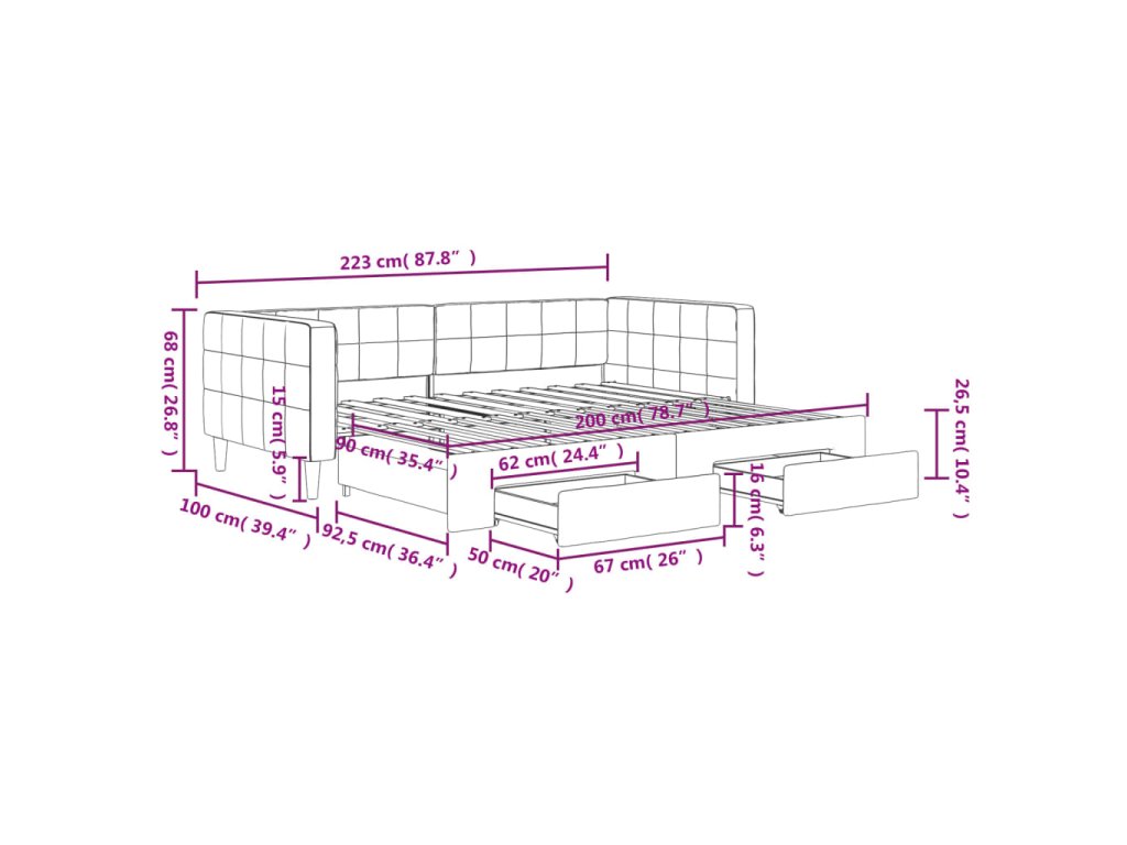 - Rozměry (nevysunuté): 223 x 100 x 68 cm (D x Š x V)
