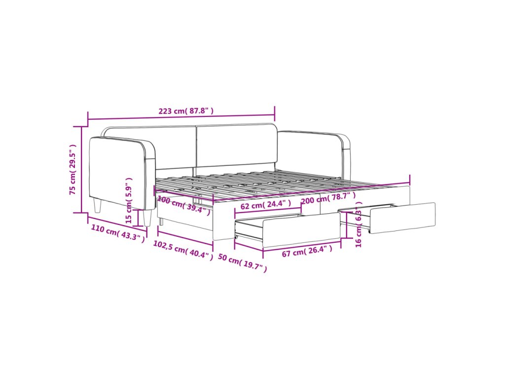 - Rozměry (nevysunuté): 223 x 110 x 75 cm (D x Š x V)