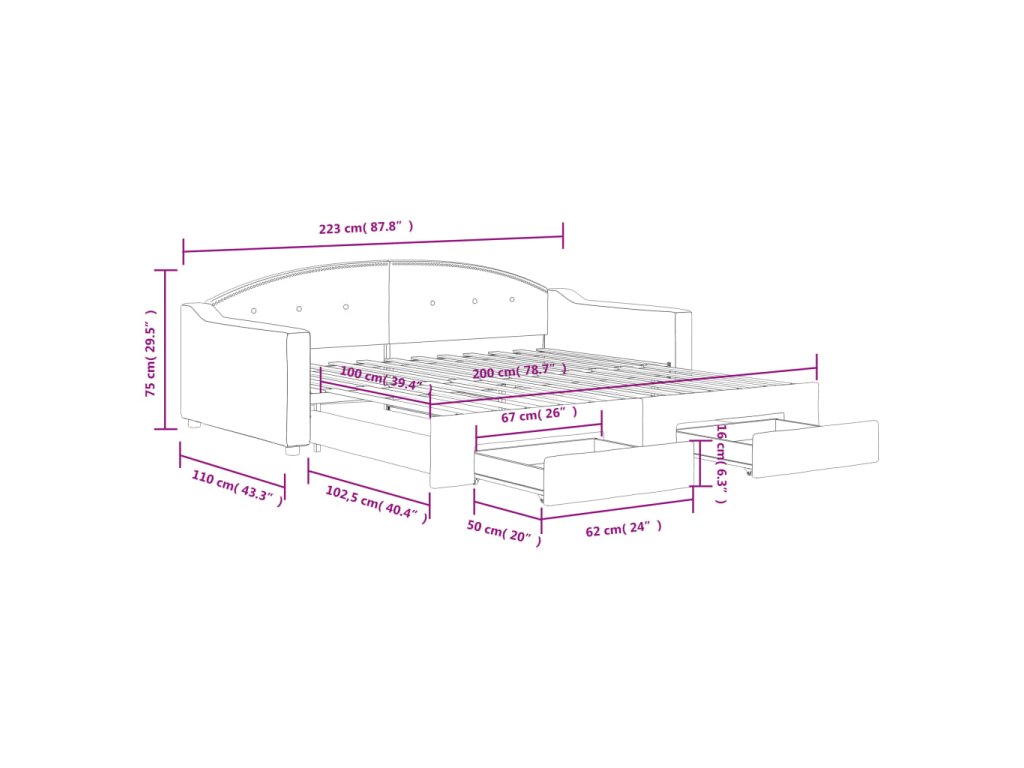 - Rozměry (nevysunuté): 223 x 110 x 75 cm (D x Š x V)