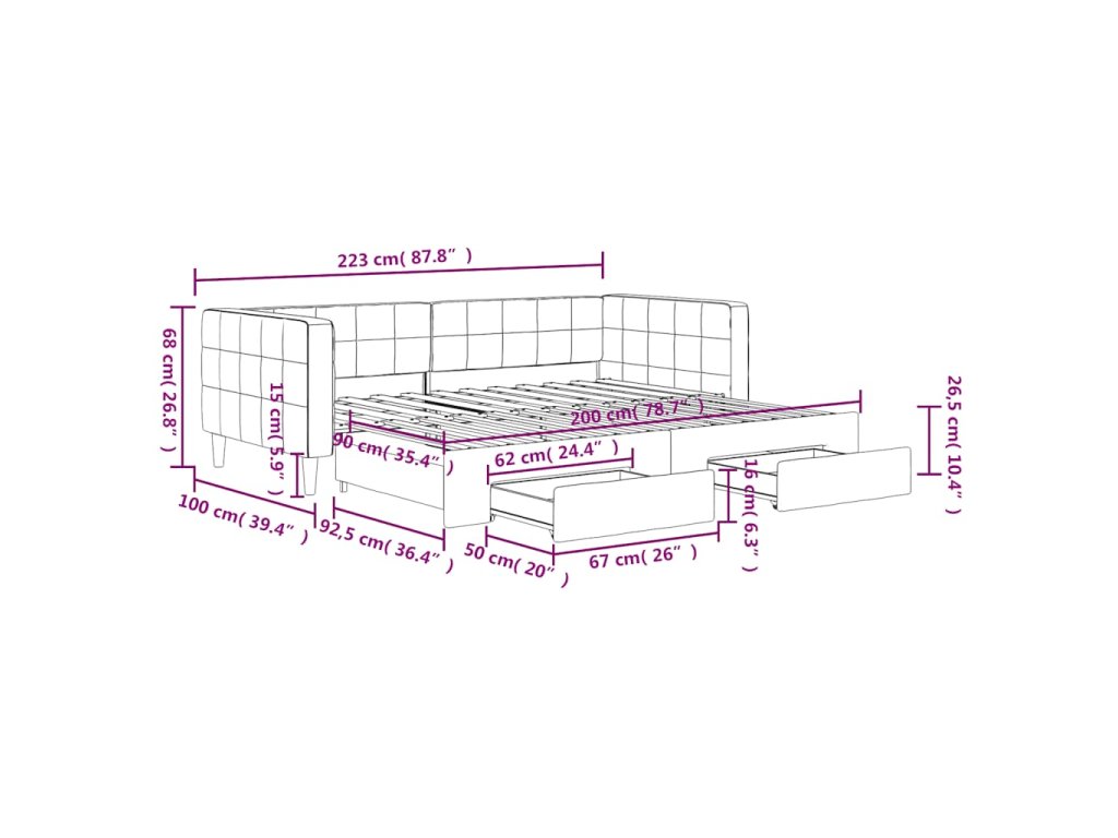 - Rozměry (nevysunuté): 223 x 100 x 68 cm (D x Š x V)