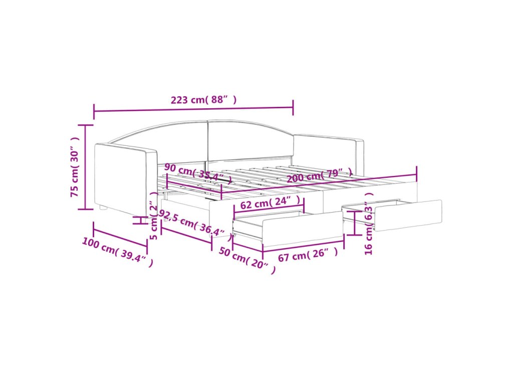 - Rozměry (nevysunuté): 223 x 100 x 75 cm (Š x H x V)