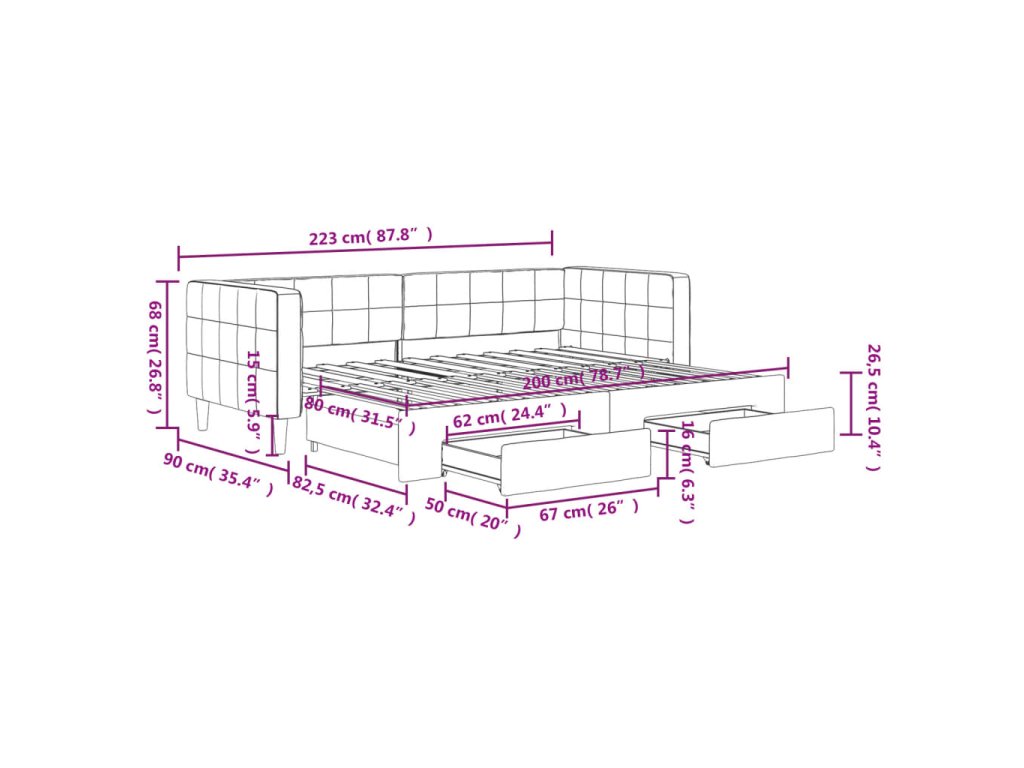 - Rozměry (nevysunuté): 223 x 90 x 68 cm (D x Š x V)