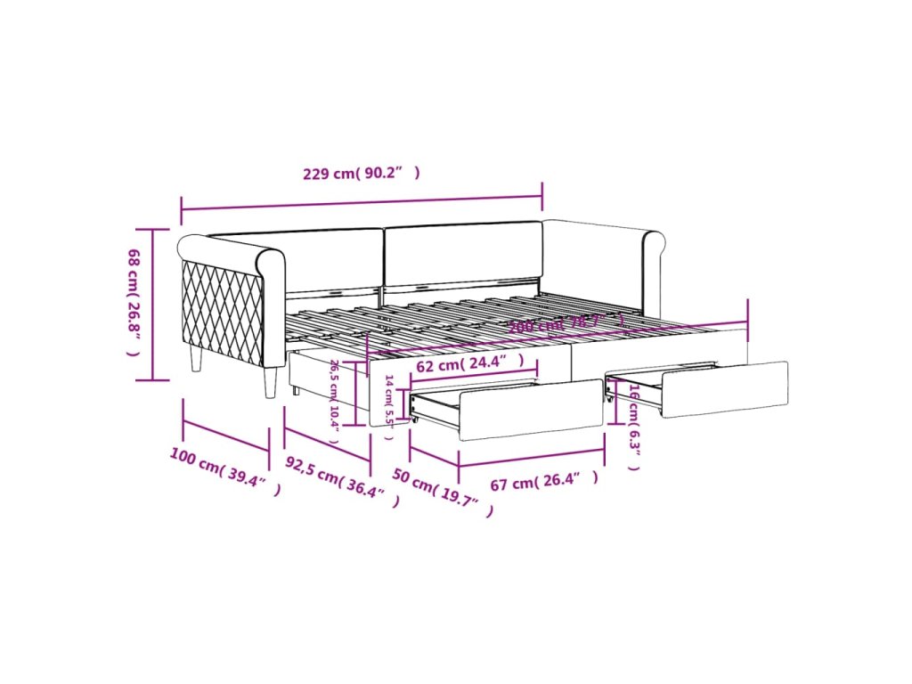 - Rozměry (nevysunuté): 229 x 100 x 68 cm (D x Š x V)