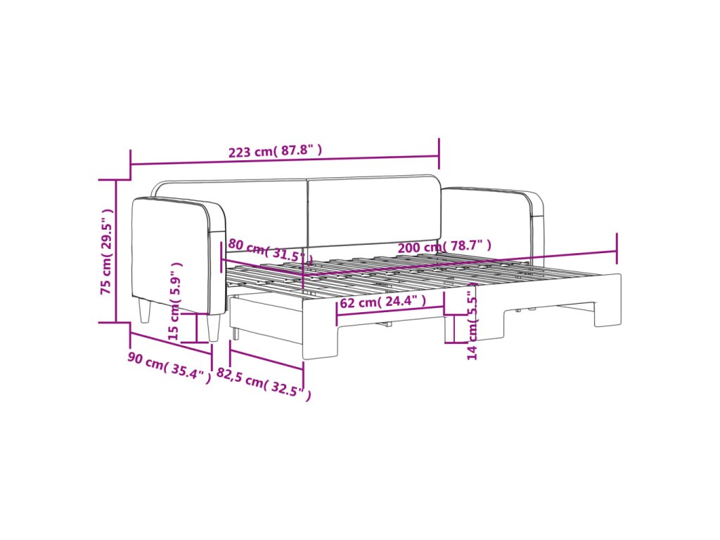 - Rozměry (nevysunuté): 223 x 90 x 75 cm (D x Š x V)