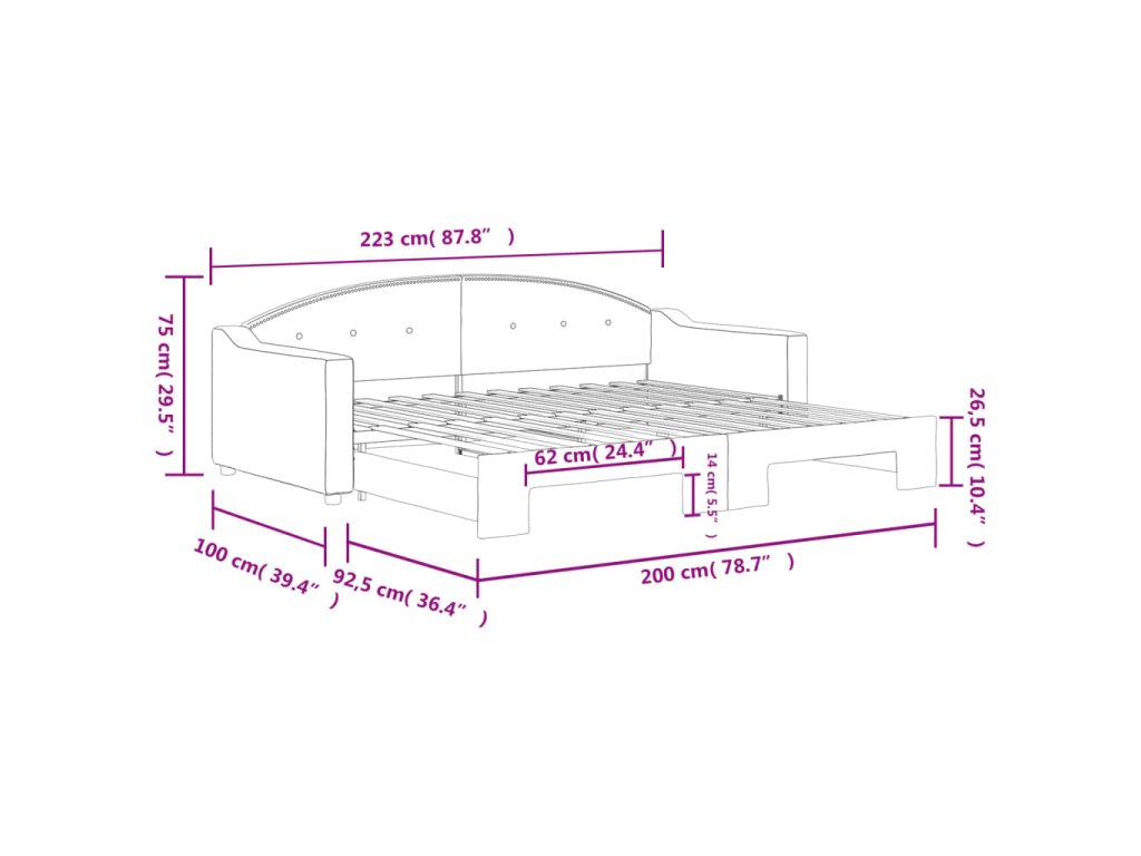- Rozměry (nevysunuté): 223 x 100 x 75 cm (D x Š x V)