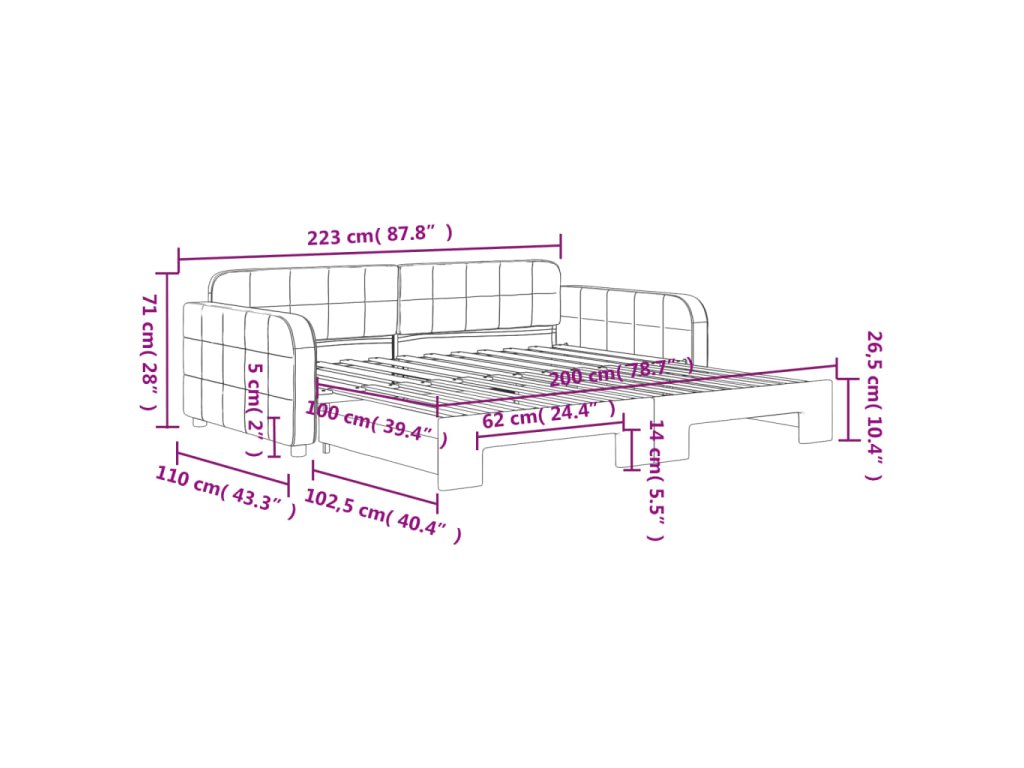 - Rozměry (nevysunuté): 223 x 110 x 71 cm (D x Š x V)