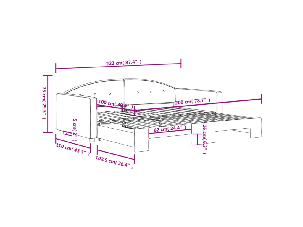 - Rozměry (nevysunuté): 222 x 110 x 75 cm (D x Š x V)