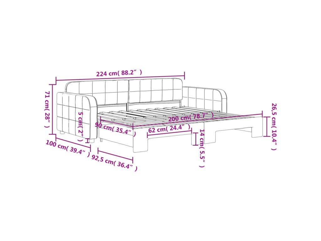 - Rozměry (nevysunuté): 224 x 100 x 71 cm (D x Š x V)