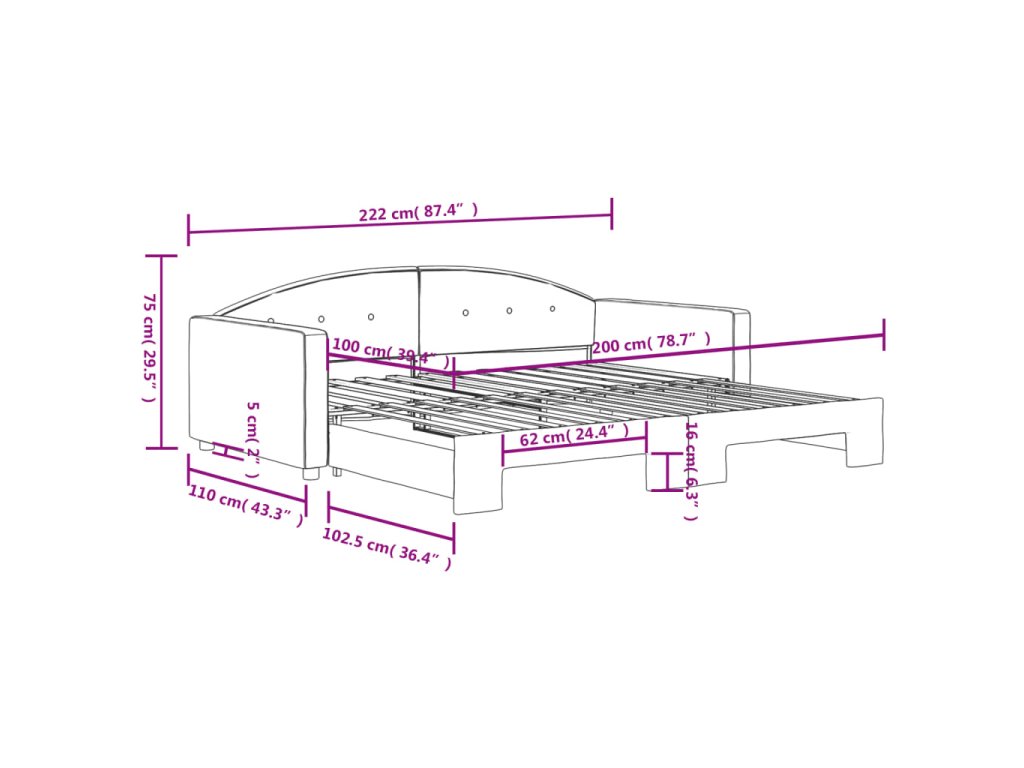 - Rozměry (nevysunuté): 222 x 110 x 75 cm (D x Š x V)