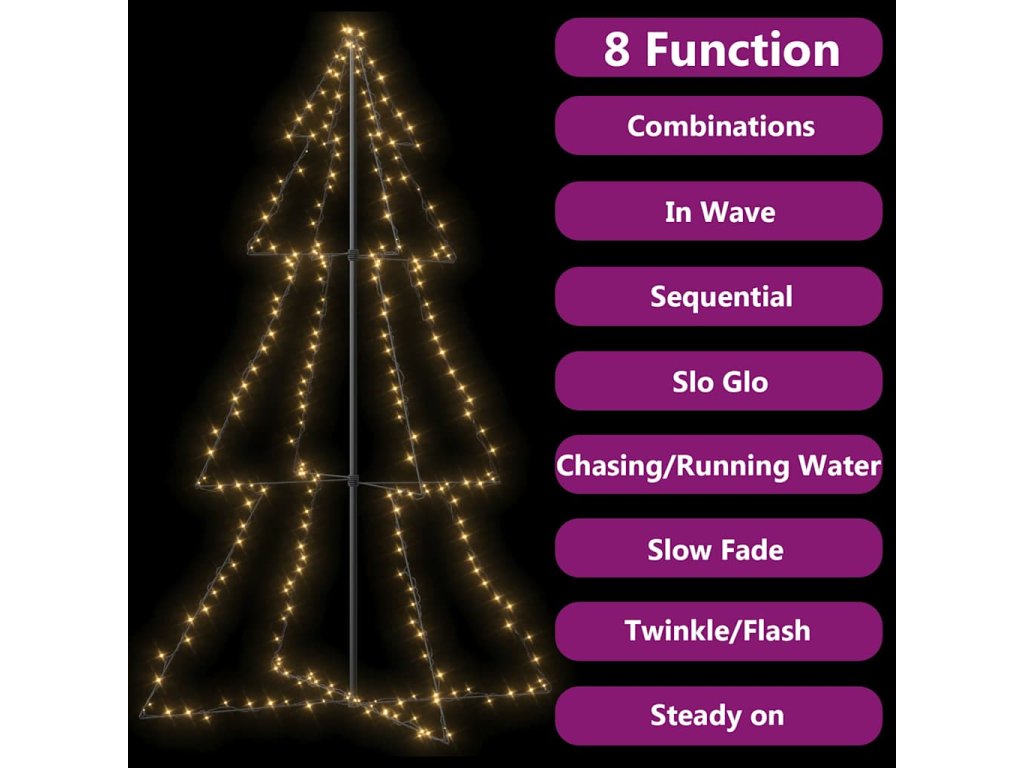 Světýlka obsahují 240 vysoce výkonných LED diod, které jsou velmi energeticky úsporné a vydávají jasné světlo. Diody mají 8 různých světelných režimů: kombinace všech, pomalá záře, blikání/mihotání, svícení ve vlnách, efekt tekoucí vody, sekvenční svícení, stálé svícení a pomalé blednutí. Světla se krásně rozzáří a vytvoří kouzelnou sváteční atmosféru. Bude to opravdová potěcha por oči, obzvláště večer, a také slouží jako útulný zdroj světla v místnosti. Volně stojící kužel lze snadno a bezpečně připevnit k zemi za pomoci přiloženého montážního materiálu.