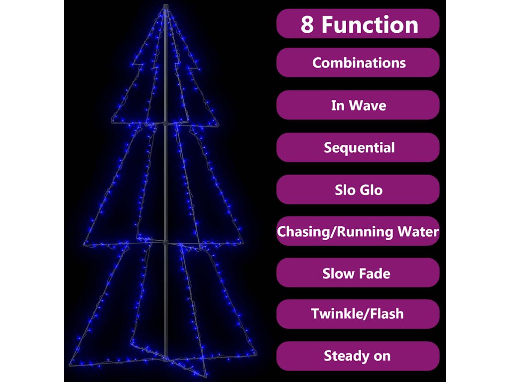 Světýlka obsahují 300 vysoce výkonných LED diod, které jsou velmi energeticky úsporné a vydávají jasné světlo. Diody mají 8 různých světelných režimů: kombinace všech, pomalá záře, blikání/mihotání, svícení ve vlnách, efekt tekoucí vody, sekvenční svícení, stálé svícení a pomalé blednutí. Světla se krásně rozzáří a vytvoří kouzelnou sváteční atmosféru. Bude to opravdová potěcha por oči, obzvláště večer, a také slouží jako útulný zdroj světla v místnosti. Volně stojící kužel lze snadno a bezpečně připevnit k zemi za pomoci přiloženého montážního materiálu.