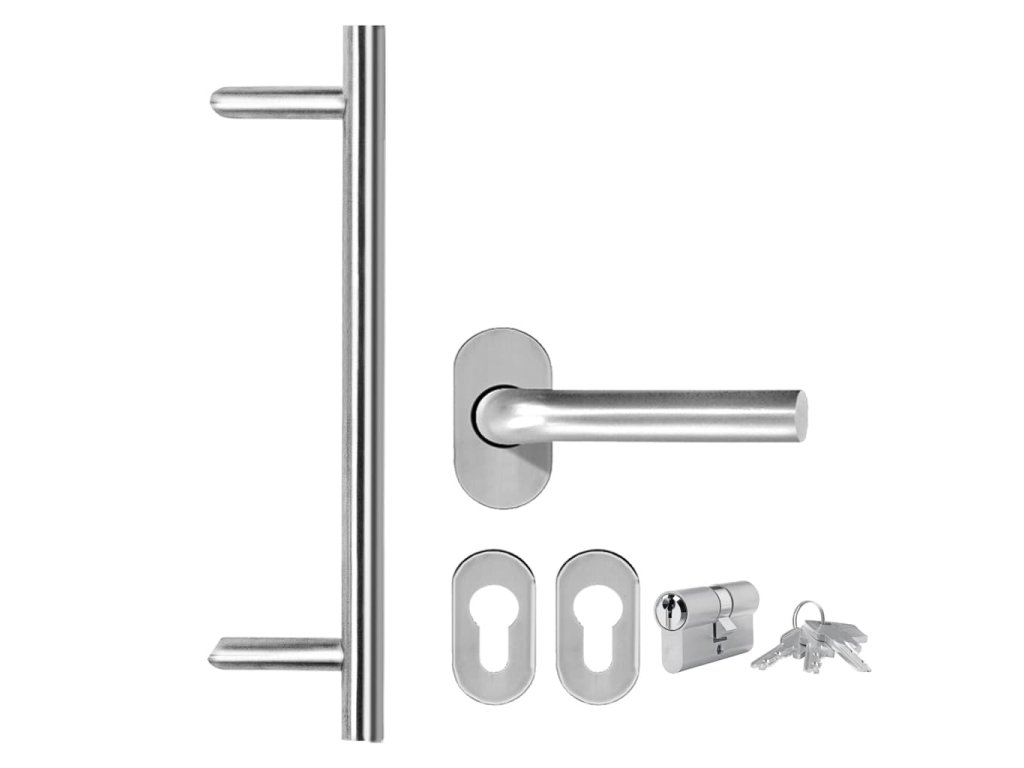 Při objednání obdržíte celou sadu, jelikož součástí balení jsou i úchytka na dveře a venkovní klika spolu s profilovou cylindrickou vložkou, klíči, těsnící páskou a montážním příslušenstvím.
