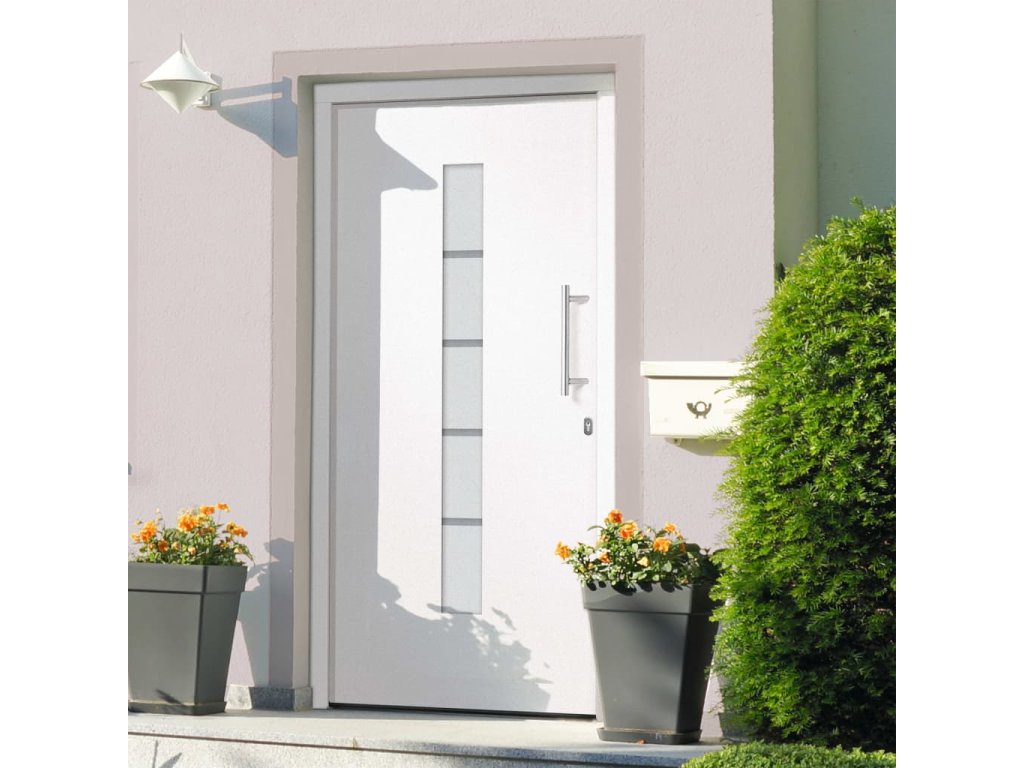 Vchodové dveře mají robustní rám i výplň, hliníkový práh, nastavitelné panty, bezpečnostní zámek s jazýčkem a háčkem a 5 stavítky, izolační zasklení a výztuhou z pozinkované oceli. Samotné dveře jsou vyrobené z hliníku a PVC a vyznačují se svou působivou bytelností a vysoce praktickým zamykáním. Obdržíte je spolu s kompletní sadou, která obsahuje nerezovou úchytku, vnitřní kliku, klíče, těsnící pásku a montážní příslušenství.