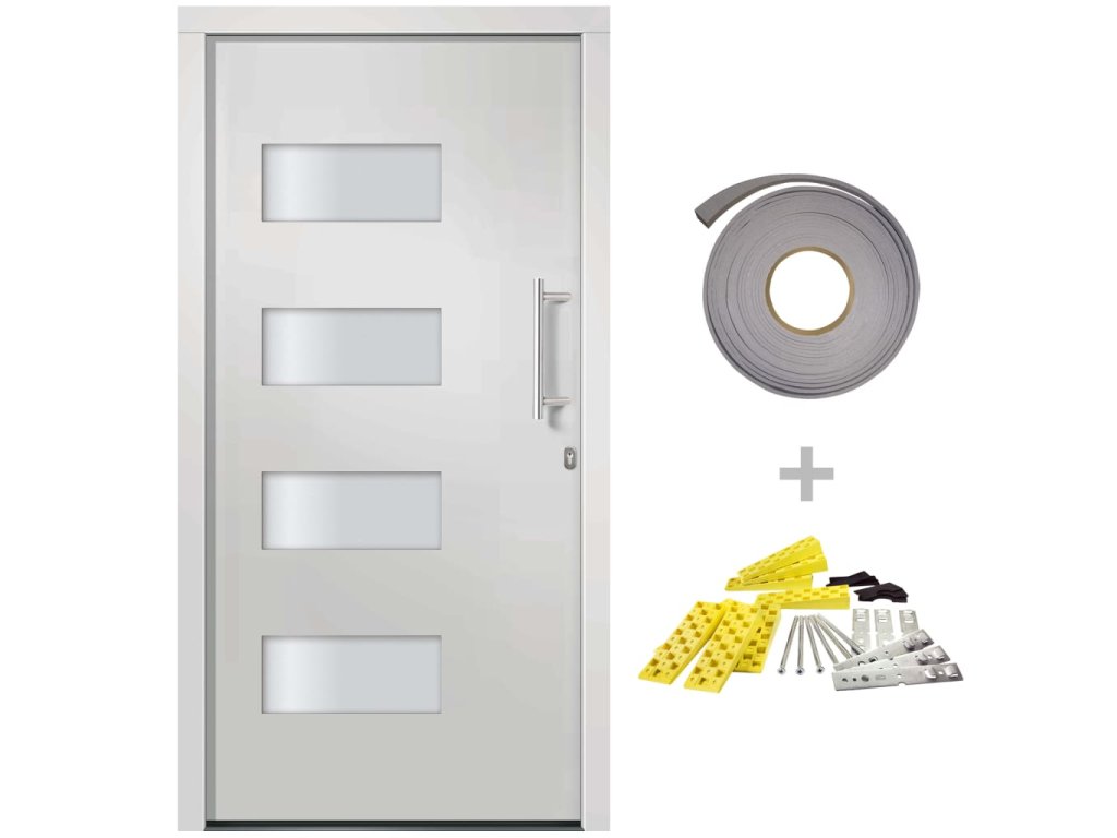 Vchodové dveře mají robustní rám i výplň, hliníkový práh, nastavitelné panty, bezpečnostní zámek s jazýčkem a háčkem a 5 stavítky, izolační zasklení a výztuhou z pozinkované oceli. Samotné dveře jsou vyrobené z hliníku a PVC a vyznačují se svou působivou bytelností a vysoce praktickým zamykáním. Obdržíte je spolu s kompletní sadou, která obsahuje nerezovou úchytku, vnitřní kliku, klíče, těsnící pásku a montážní příslušenství.
