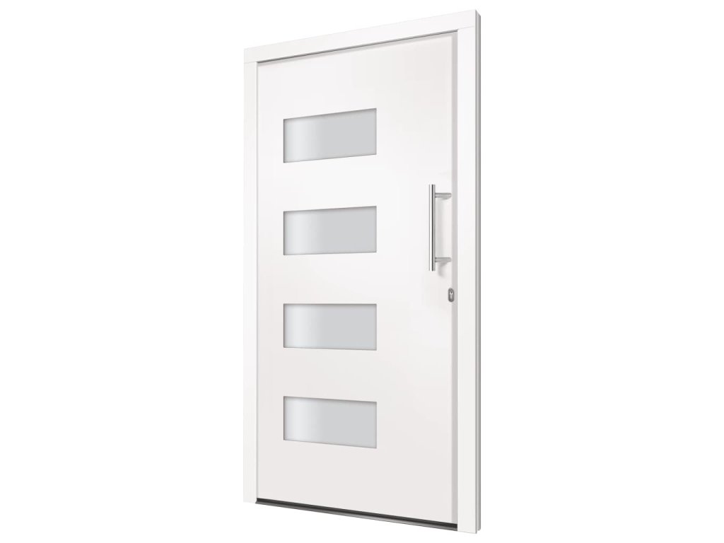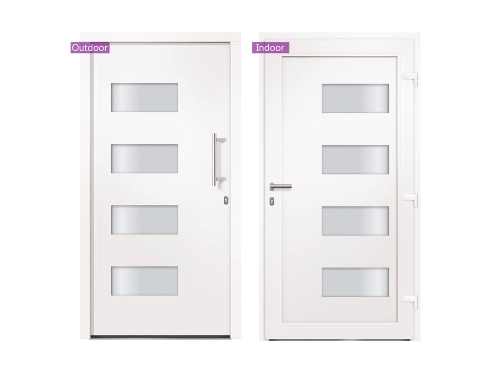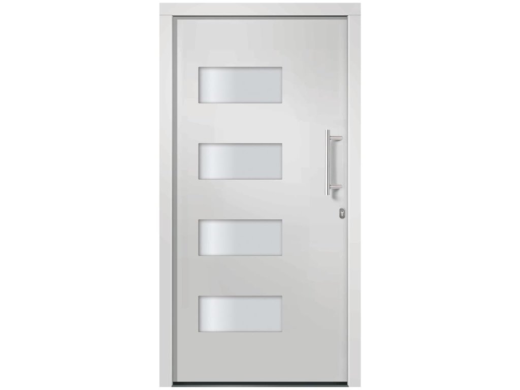 Vchodové dveře mají robustní rám i výplň, hliníkový práh, nastavitelné panty, bezpečnostní zámek s jazýčkem a háčkem a 5 stavítky, izolační zasklení a výztuhou z pozinkované oceli. Samotné dveře jsou vyrobené z hliníku a PVC a vyznačují se svou působivou bytelností a vysoce praktickým zamykáním. Obdržíte je spolu s kompletní sadou, která obsahuje nerezovou úchytku, vnitřní kliku, klíče, těsnící pásku a montážní příslušenství.