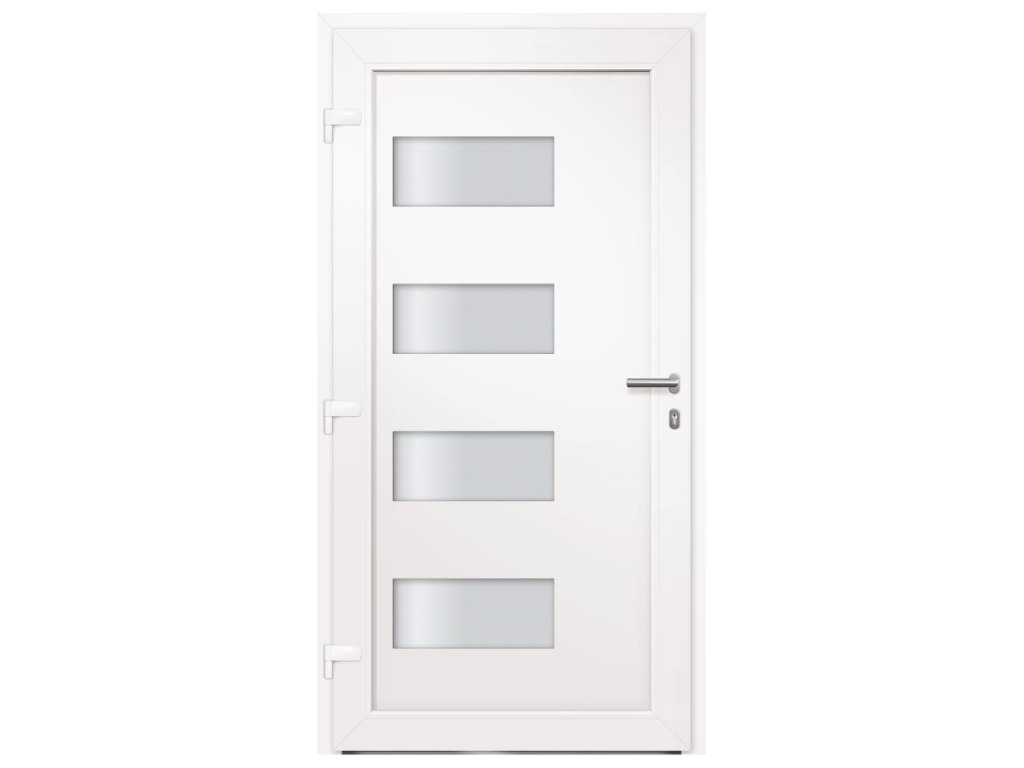Vchodové dveře mají robustní rám i výplň, hliníkový práh, nastavitelné panty, bezpečnostní zámek s jazýčkem a háčkem a 5 stavítky, izolační zasklení a výztuhou z pozinkované oceli. Samotné dveře jsou vyrobené z hliníku a PVC a vyznačují se svou působivou bytelností a vysoce praktickým zamykáním. Obdržíte je spolu s kompletní sadou, která obsahuje nerezovou úchytku, vnitřní kliku, klíče, těsnící pásku a montážní příslušenství.