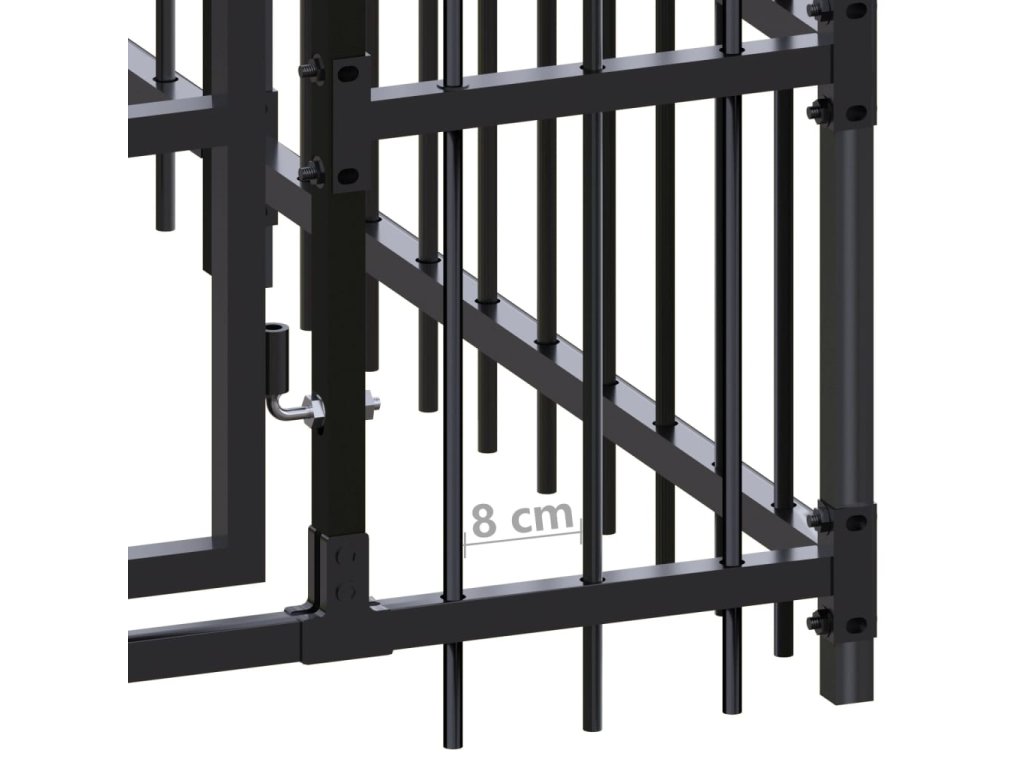 Tento psí kotec poskytuje dostatek prostoru pro cvičení. Stěny z ocelových tyčí pomáhají předcházet neplechám a neočekávaným nehodám a zároveň umožňují větrání. Díky robustní ocelové konstrukci s práškovým nástřikem je tento psí kotec odolný a vyrobený pro dlouhou životnost. Střecha chrání před sluncem, deštěm, sněhem a dalšími povětrnostními vlivy. Dveře s výklopnými dveřmi a uzamykatelným západkovým systémem zajišťují vašim psům větší bezpečnost a ochranu.
