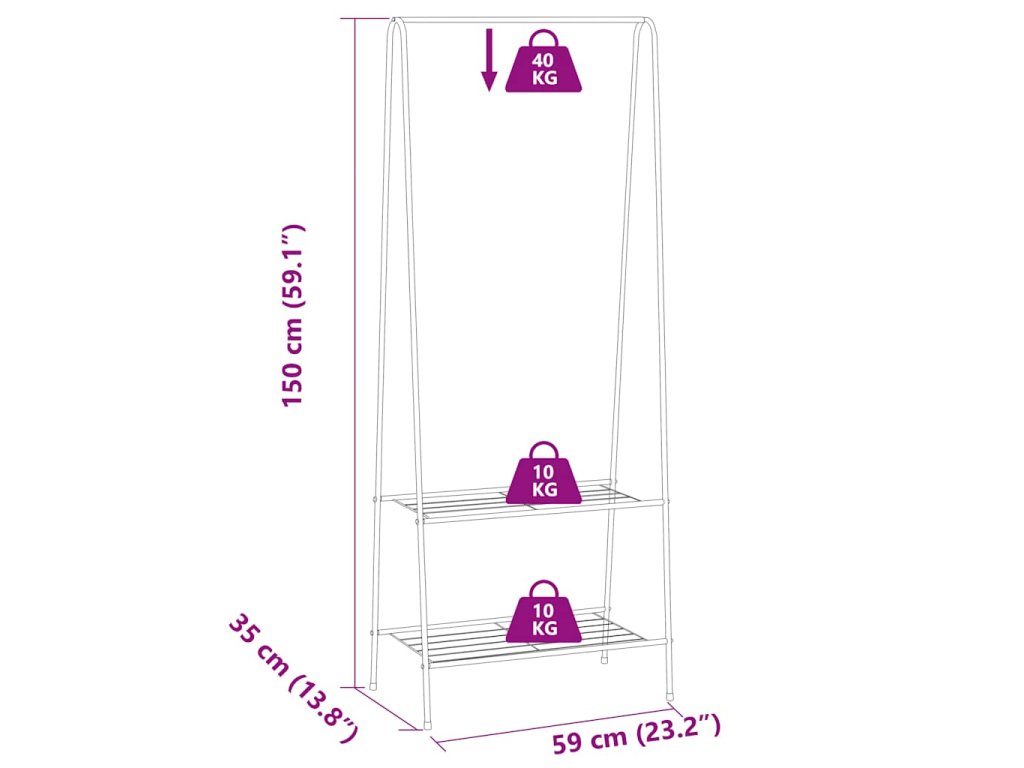 Věšák na oblečení tvoří robustní ocelový rám, díky němuž je věšák stabilní a odolný. Disponuje 2 policemi, které vám poskytnou spoustu úložného prostoru pro odkládání vašich kabelek či bot. Jednoduchý a přitom stylový design vnese do vašeho domova nádech elegance.