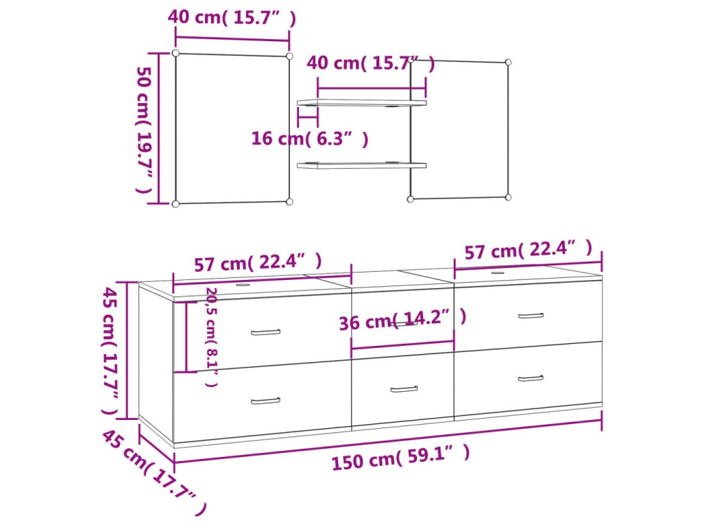 - Rozměry nástěnné skříňky pod umyvadlo: 150 x 45 x 45 cm (D x Š x V)