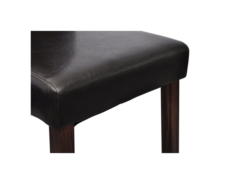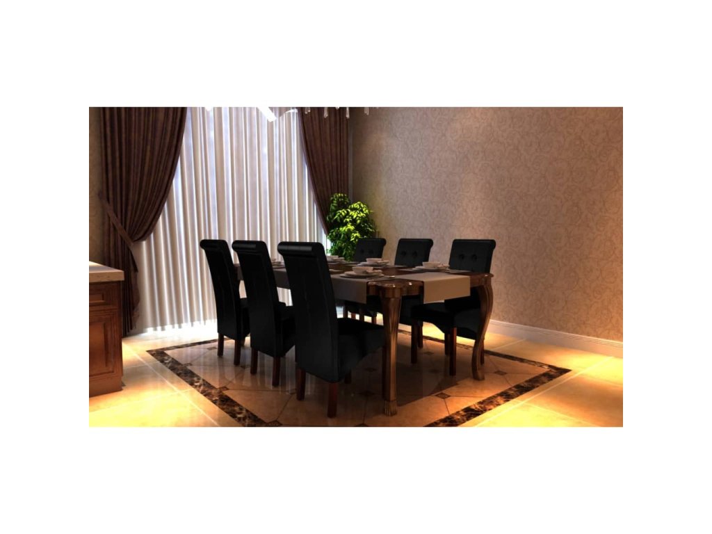 Tento set 6 pohodlných a širokých jídelních židlí má rustikální design s ergonomicky tvarovanými sedadly a opěradly. Nohy jsou vyrobené z masivního dřeva s tmavě hnědou lazurou. Jejich rohy jsou pro větší bezpečnost zaoblené. Údržba a čištění jsou velmi snadné. Sedadla a opěradla těchto jídelních židlí jsou polstrovaná odolnou syntetickou kůží.