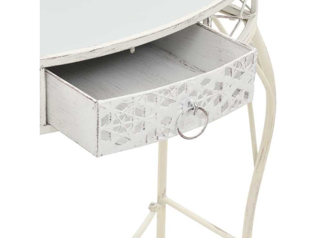 Stolek má kovový rám a skleněnou stolní desku, je stabilní a snadno se čistí. Odkládací stolek disponuje zásuvkou, která je zdobená vkusnými ornamenty, jež stolku propůjčují starožitný vzhled a vnesou do vašeho domova nádech elegance. Montáž výrobku je snadná.