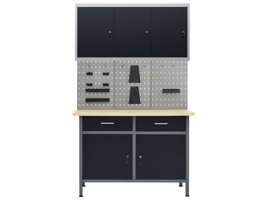 Tato dílenská sada 1 pracovního stolu se 3 nástěnnými panely a 1 nástěnnou skříňkou je praktické úložné řešení pro vaši dílnu a garáž.