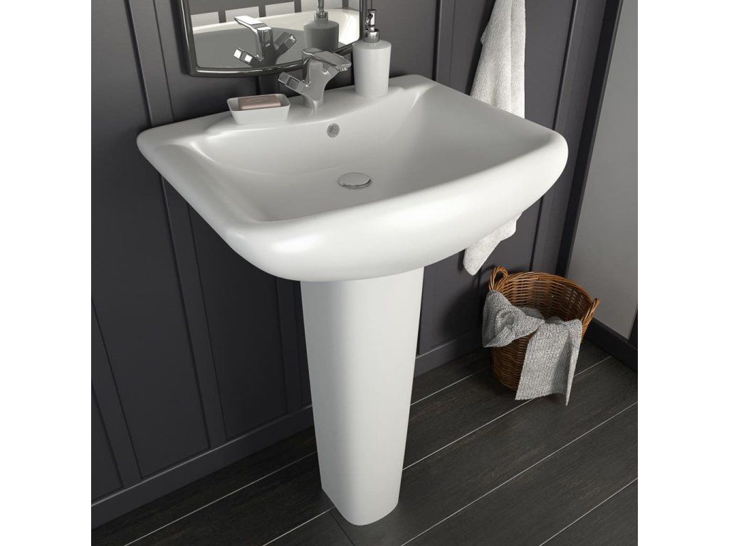Naše volně stojící keramické umyvadlo sedí na podstavci. Zkrášlí každou koupelnu, umývárnu či převlékárnu.