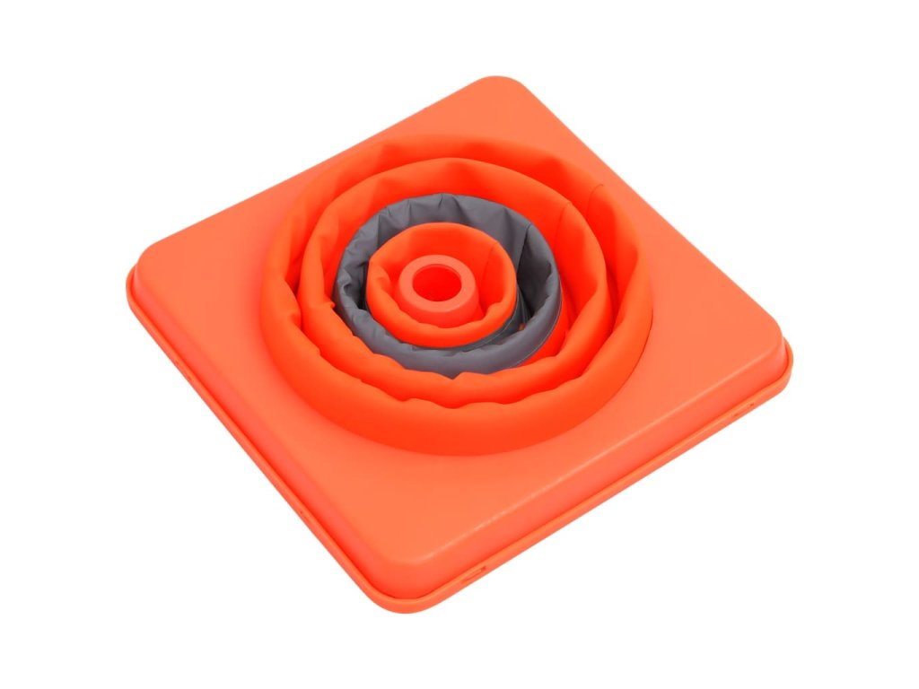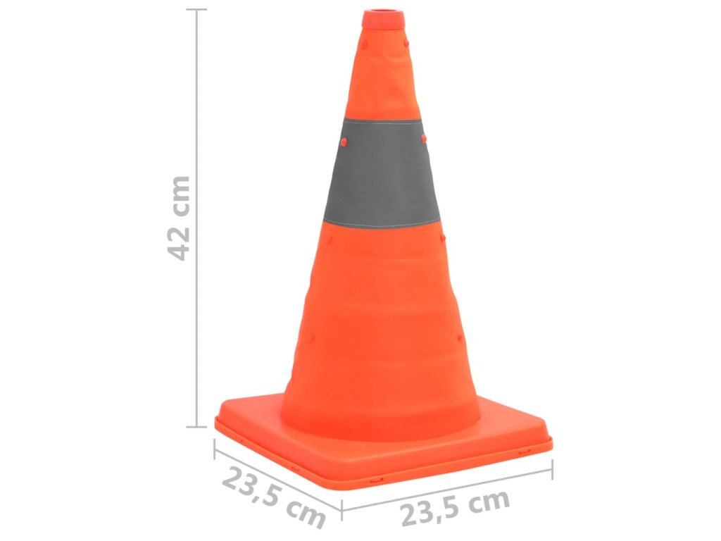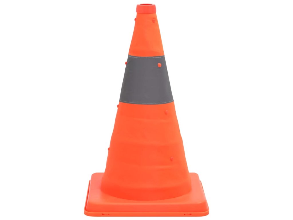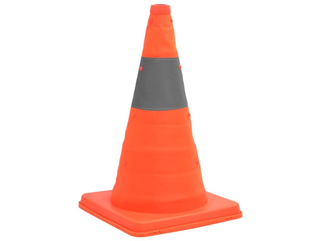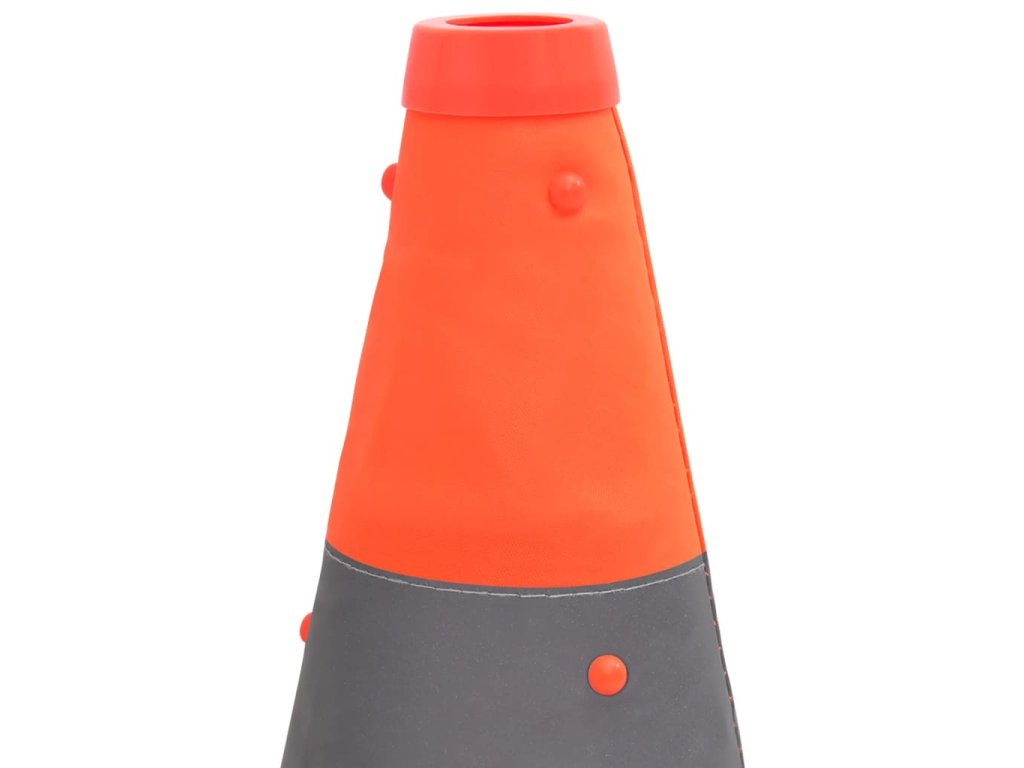Skládací dopravní kužely mají jasně oranžovou barvu a vysoce viditelné reflexní proužky, které upozorní ostatní motoristy na vaše vozidlo u silnice i za špatných světelných podmínek. Skládací dopravní kužely mají vyskakovací provedení, takže je lze snadno skladovat. Chcete-li kužel rozložit, jednoduše vytáhněte střed nahoru do jeho plné výšky a umístěte jej na viditelné místo pro ostatní účastníky silničního provozu.