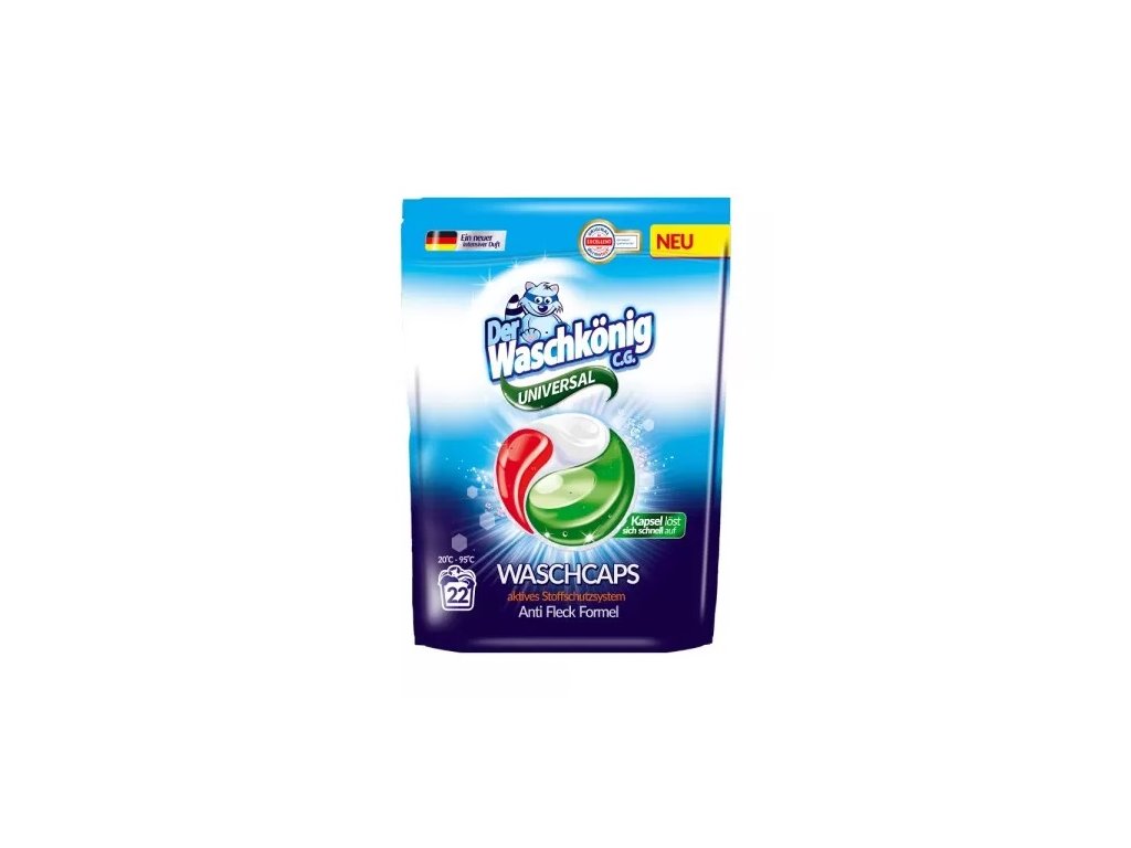 Tříkomorové gelové kapsle Der Waschkönig Universal jsou vhodné pro praní barevných i bílých tkanin. 3-enzymový systém aktivně podporuje proces praní a důkladně odstraňuje všechny druhy skvrn a nečistot. Ekologický a veganský produkt. Balení obsahuje 22 kapslí.