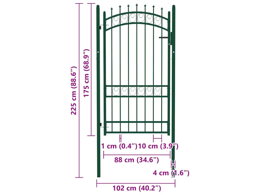Plotová branka je vyrobená z vysoce odolné oceli, má robustní konstrukci s práškovým nástřikem proti rzi a korozi. Zahradní branka je vybavená vertikálním pruty zakončenými hroty a silnou vodorovnou výztuží, takže vám poskytne vysoký stupeň zabezpečení. Klenutý design jí dodává na eleganci. Součástí balení jsou dva pevné sloupky s robustními závěsy pro snadnou instalaci a také zámek se třemi klíči.