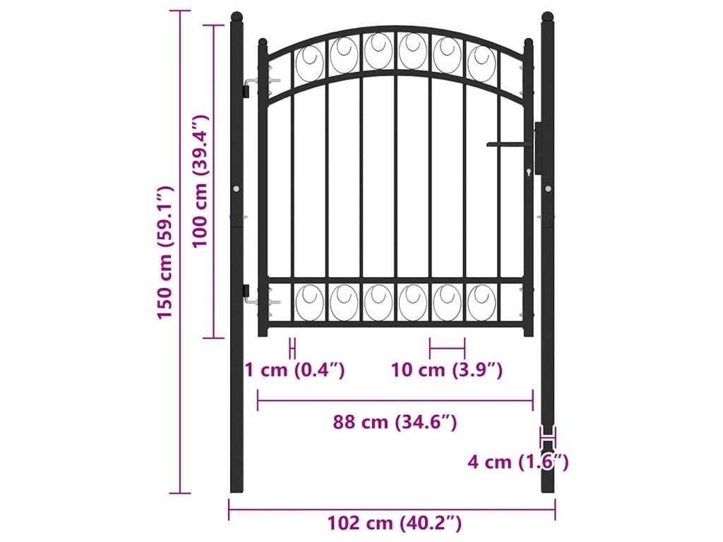Elegantní zaoblený design naší branky je velmi atraktivní. Silné vodorovné příčky zpevňují její rám a zvyšují její bezpečnost. Branka tak tvoří působivý vstup na váš pozemek. Je vyrobená z vysoce odolné oceli a ošetřená práškovým lakem, který ji chrání před rzí a korozí. Zahradní branka je rovněž vybavena zamykacím systémem se třemi zahrnutými klíči. Dodáváme ji spolu se dvěma robustními sloupky s pevnými závěsy pro snadnou instalaci.