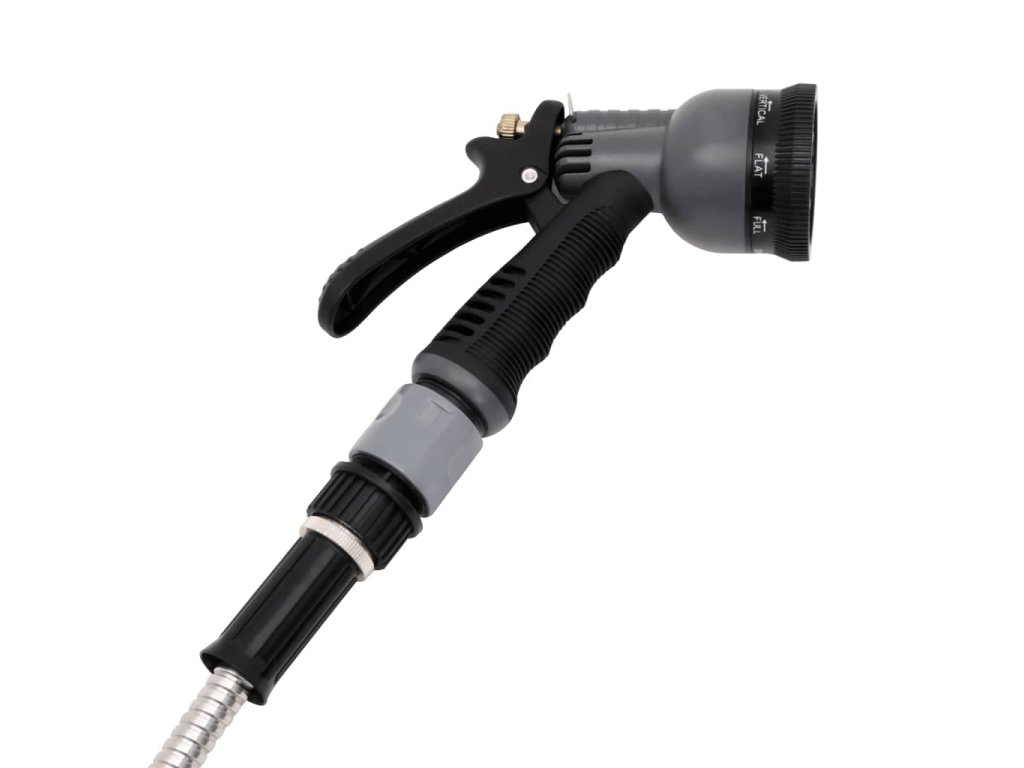 - Rozprašovací tryska s 8 funkcemi: Tato tryska má 8 režimů a otáčením trysky si můžete zvolit typ postřiku, který bude vyhovovat různým účelům zavlažování. Zároveň má protiskluzovou a pohodlnou rukojeť, aby se vám s ní dobře zacházelo.