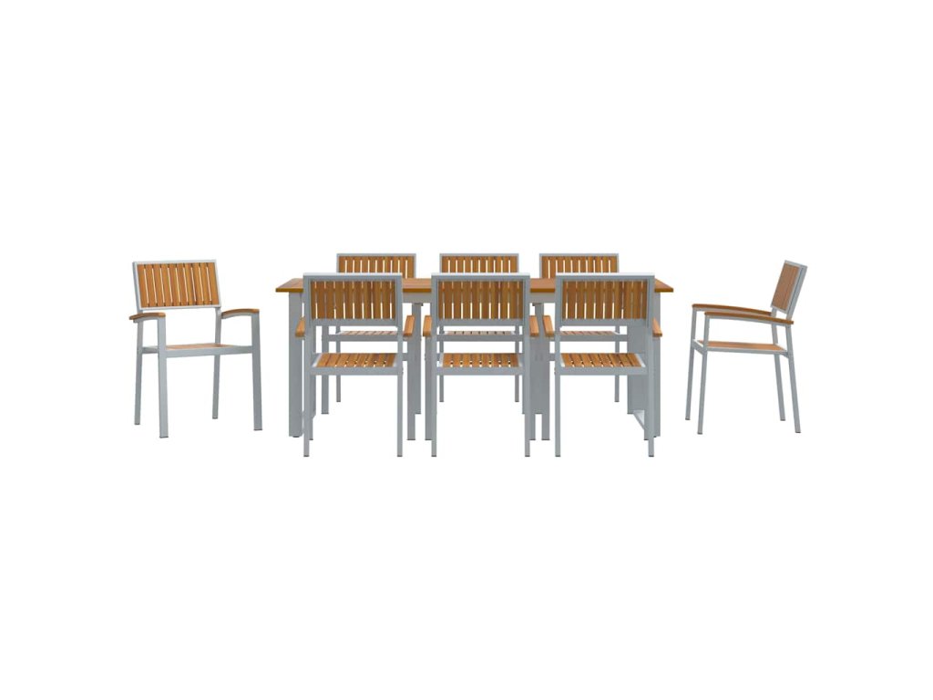 Tento moderní zahradní jídelní set je stvořený pro současné venkovní prostory. Nabízí stylové a praktické řešení pro jídlo venku v zahradách a na terasách. Jeho jednoduché a čisté linie se skvěle hodí do různých venkovních prostředí a poskytují pohodové místo pro jídlo a společenské chvíle. Povrch akáciového dřeva je krásně bohatý a geometrická struktura vypadá elegantně, takže se hodí do každé venkovní atmosféry.