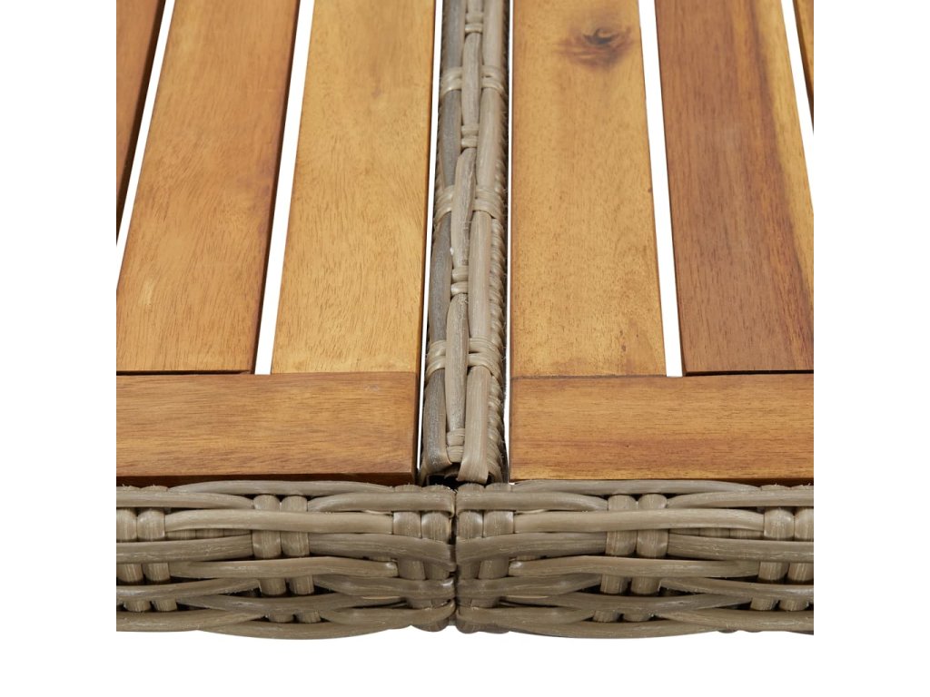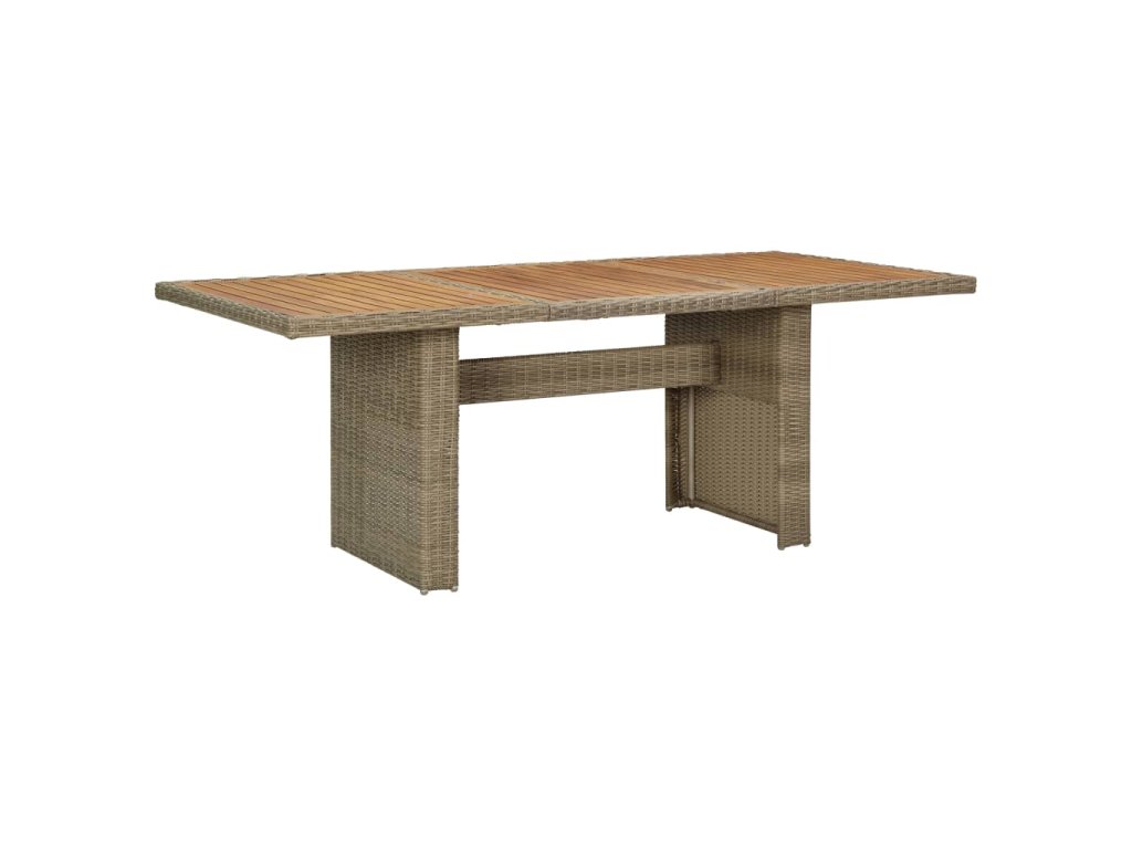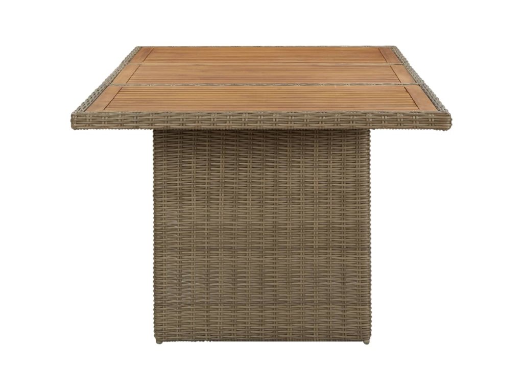 Zahradní stůl je vyrobený z PE ratanu, a proto je odolný vůči povětrnostním vlivům a má dlouhou životnost. Práškově lakovaný ocelový rám a dřevěná stolní deska z akáciového dřeva je robustní a stabilní. Stůl má lehkou konstrukci a snadno se přesouvá.