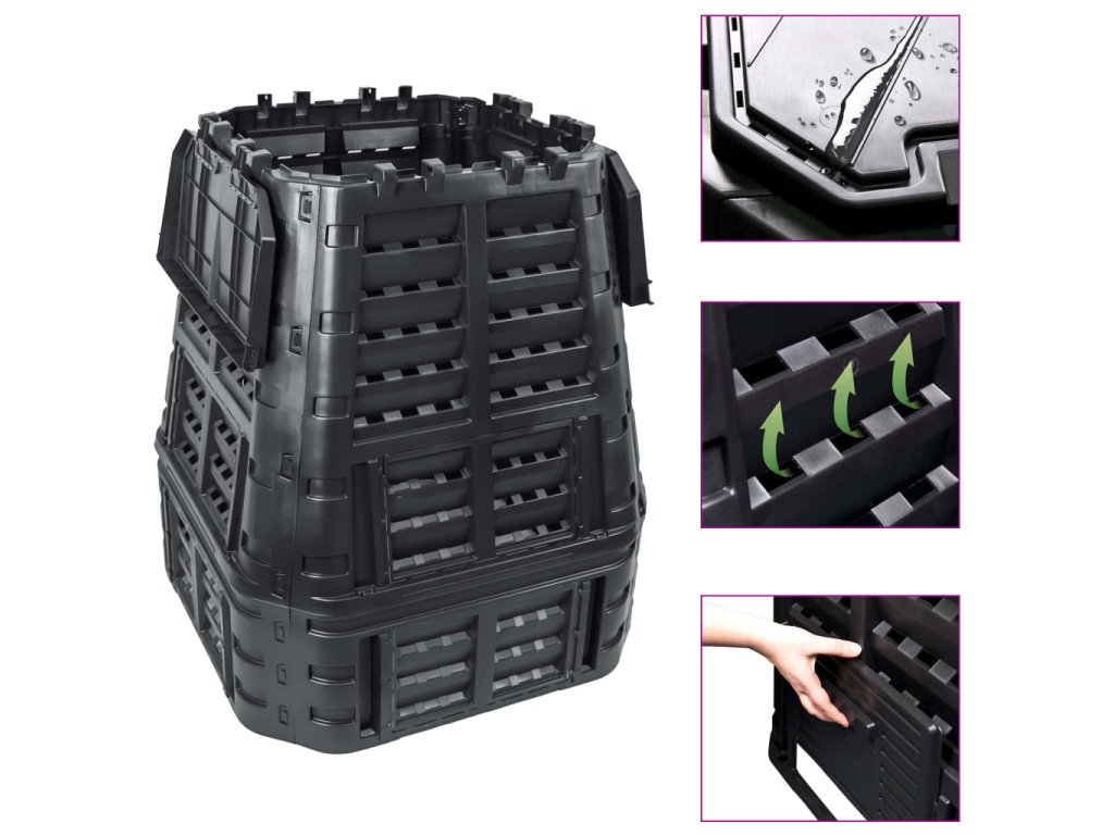 Vysoká teplota, která vzniká uvnitř kompostéru, urychluje bakteriální rozklad a vytváří lepší humus. Kontejner má kompaktní design, takže nezabírá příliš místa, ale zároveň nabízí mohutný vnitřní objem. Horní víka umožňují snadné plnění shora, zatímco vyklápěcí dvířka ve spodní části naopak zajišťují jednoduché vytahování humusu. Kapkový zavlažovací systém, otvor na visací zámek, pevné postranní západky, odolné panty vík, praktická rukojeť a velká posuvná dvířka s šikovnými úchytkami navíc přispívají k velmi pohodlnému používání.