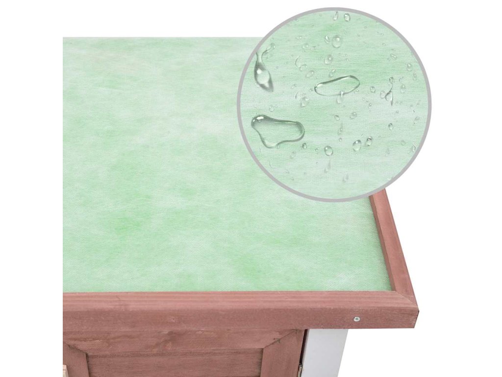 Králíkárna je vyrobena z vysoce kvalitního dřevěného rámu, takže poskytuje pevné a bezpečné přístřeší, které vydrží po celé roky. Její zelená střecha nepropouští déšť a útulný pelíšek uvnitř je skvělý na spaní. Dva výsuvné zásobníky usnadňují čištění. Dvířka se snadno zavírají a dají se zajistit posuvnou západkou.