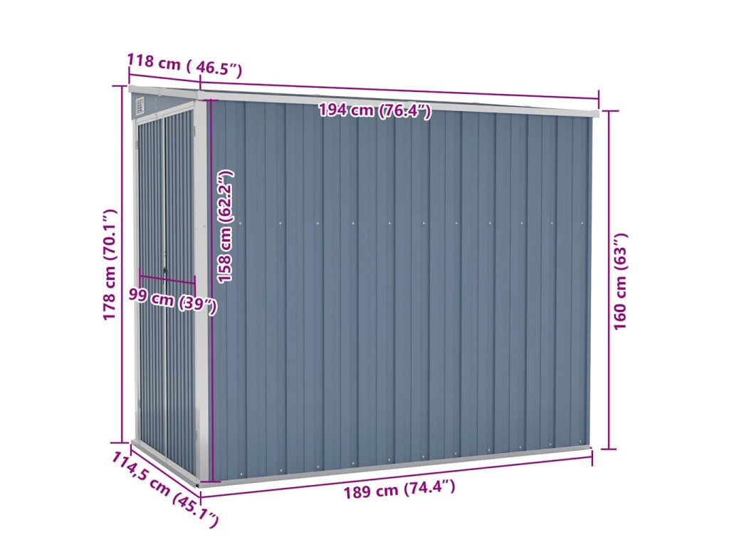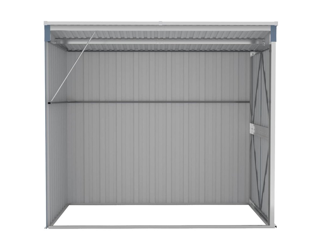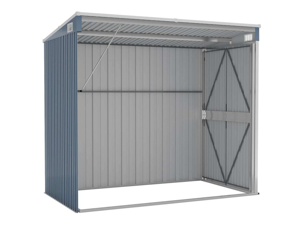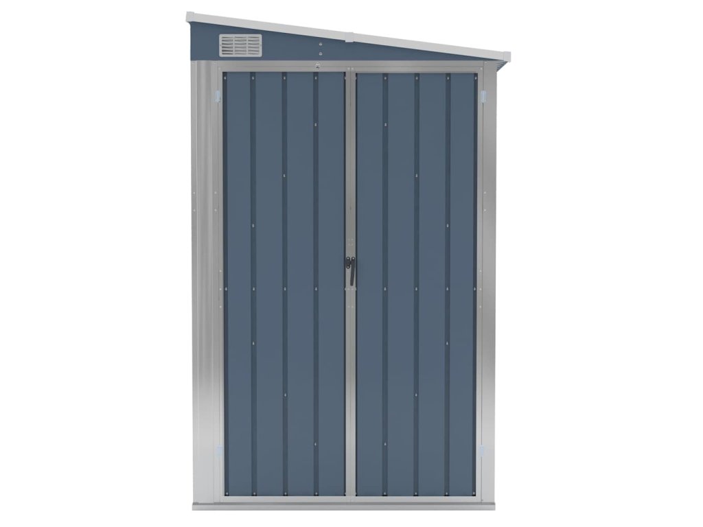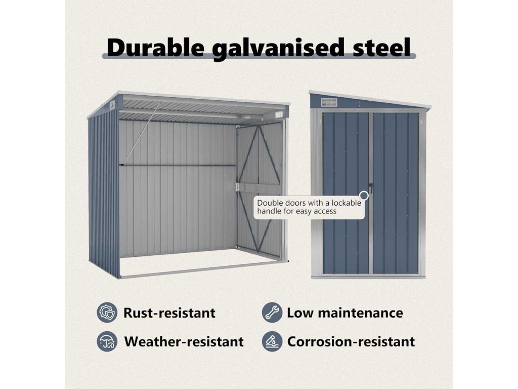 Díky tomu, že je vyroben z pozinkované oceli a kovu, vyžaduje sklad minimální údržbu a je velmi odolný. Dvojité otevírací dveře v přední části umožňují snadný vstup a výstup. Plastová rukojeť s funkcí zámku zajišťuje bezpečnost vašich věcí. Navíc dešťová voda automaticky odtéká ze střechy díky šikmé konstrukci.