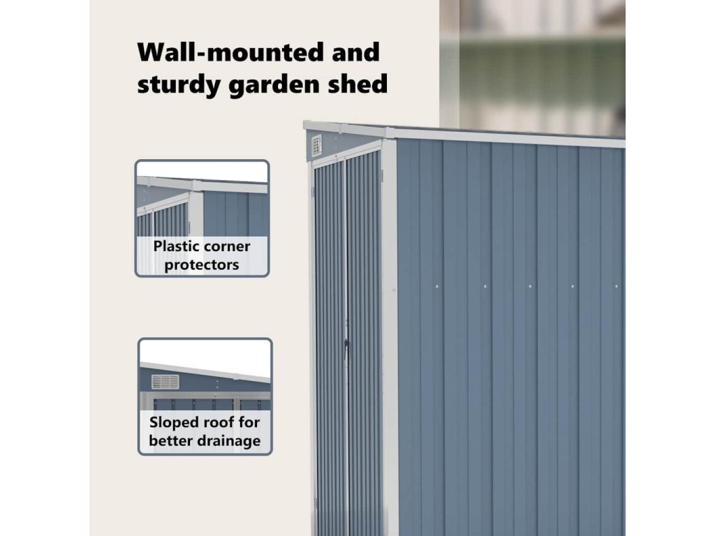 Tento nástěnný zahradní domek je ideální pro uložení různých předmětů, jako je nářadí, zahradní nábytek, zahradní vybavení atd. Domek nabízí ochranu před nečistotami, prachem a také před silným větrem a povětrnostními vlivy.