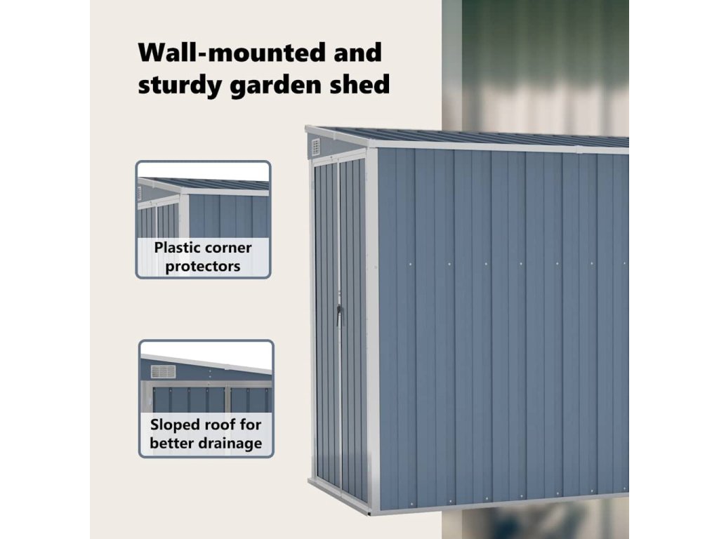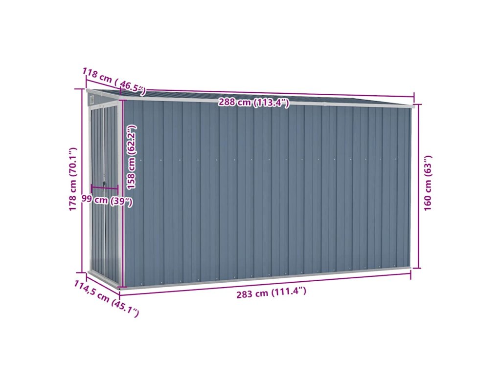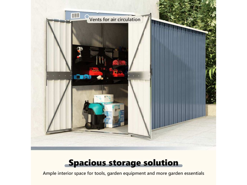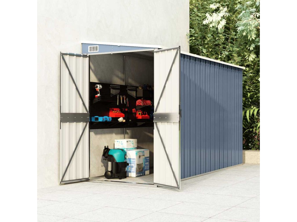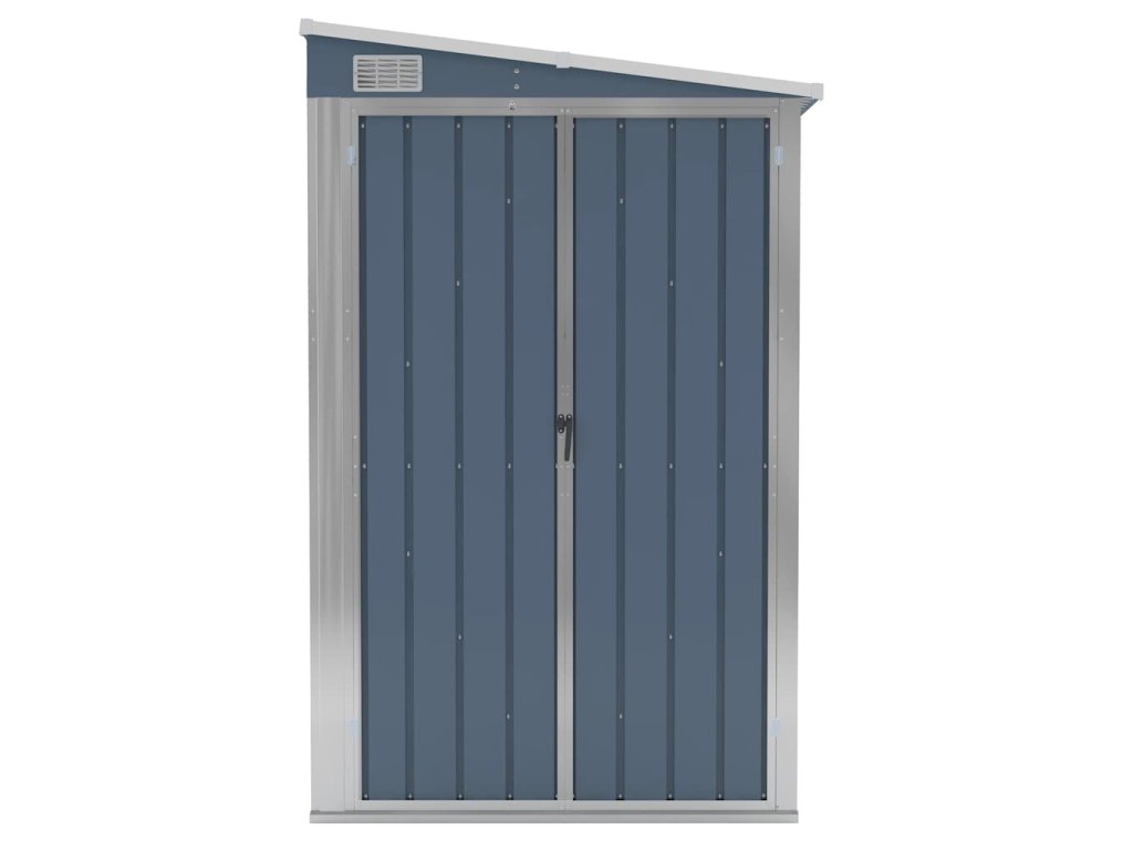Protože je vyrobený z pozinkované oceli a kovu, vyžaduje minimální údržbu a je velmi odolný. Dvojité otevírací dveře v přední části umožňují snadný vstup a výstup. Plastová zamykací klika zajišťuje bezpečnost uložených věcí. Dešťová voda ze šikmé střechy automaticky odtéká.